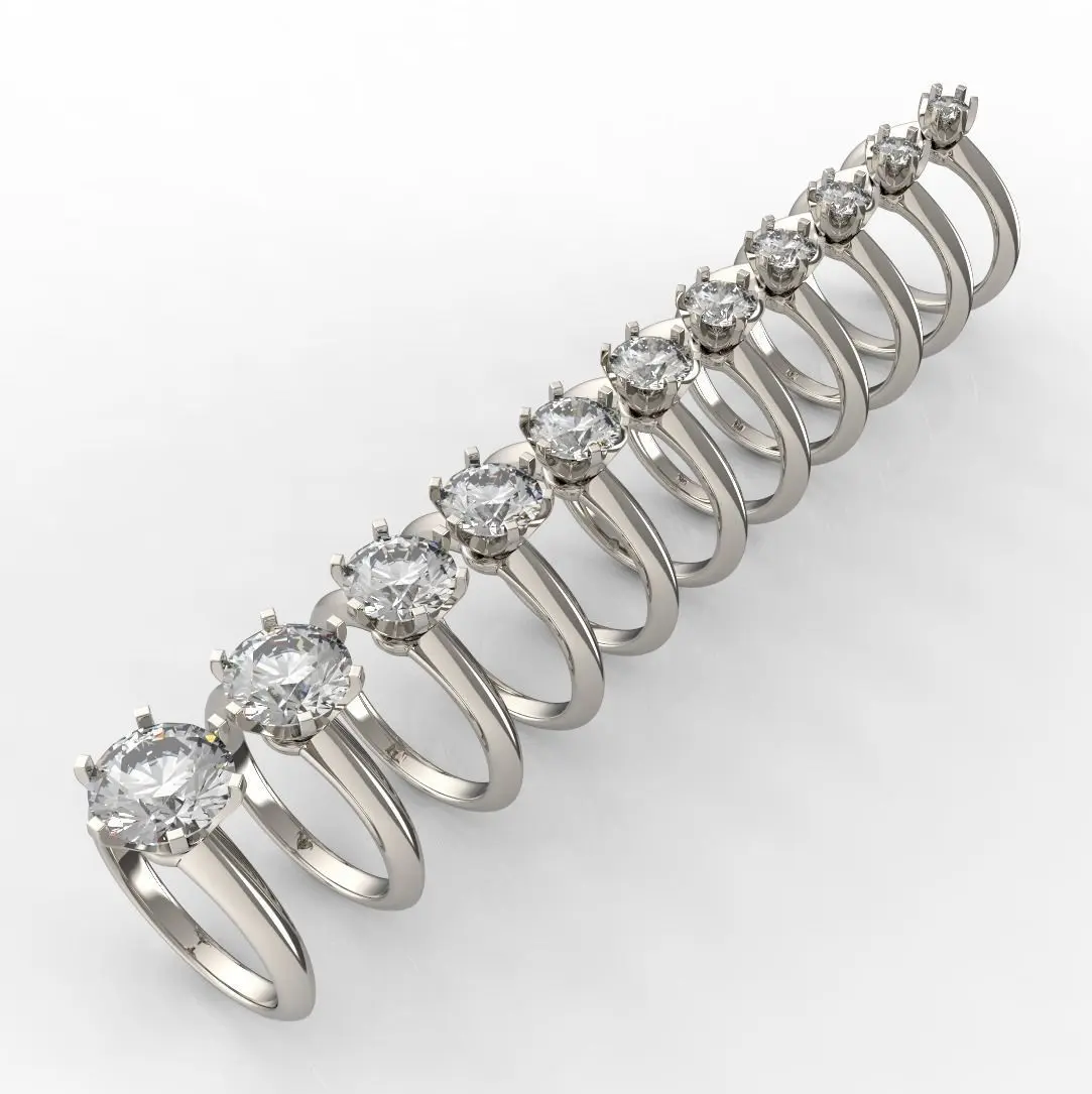 The set consists of 11 rings with stone sizes from 4.0 mm to 9.0 mm, in increments of 0.5 mm