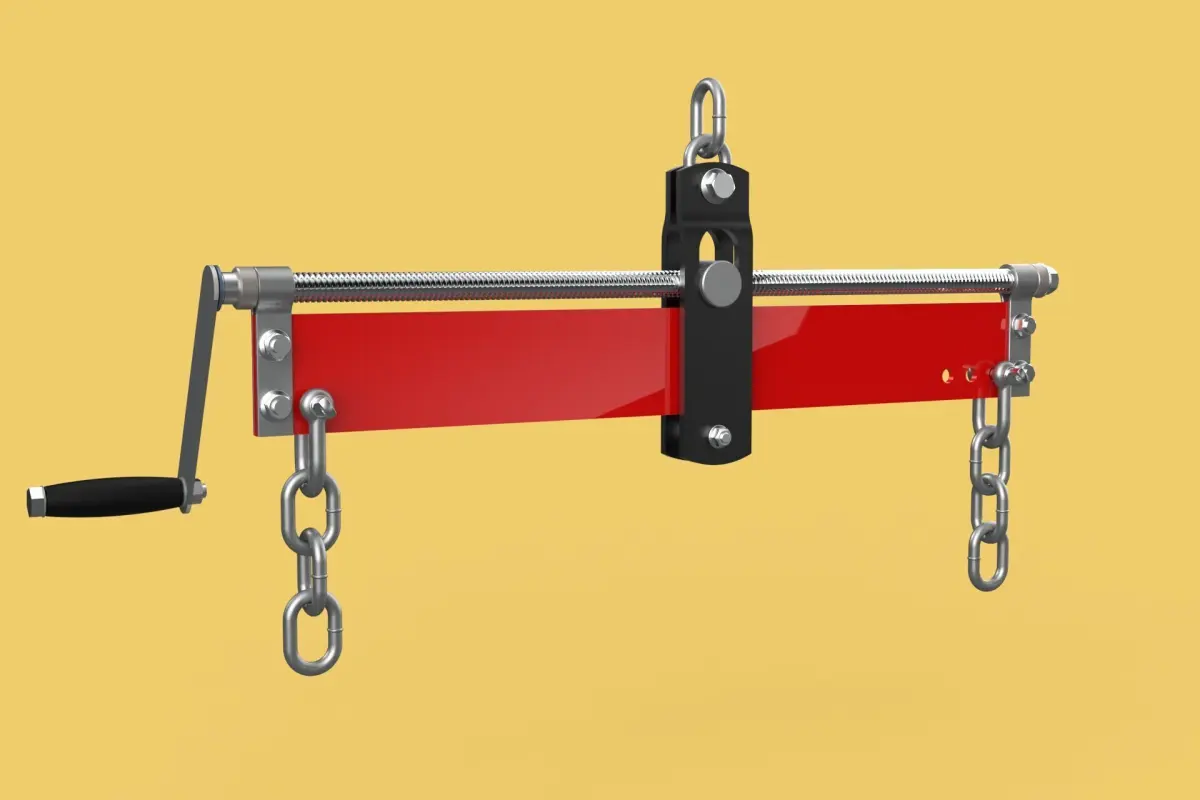 Engine Hoist / Crane Compatibility: Designed to easily attach to the hook of an engine hoist or shop crane.Load Balancing: The core feature is its ability to adjust the center of gravity of the load. It typically achieves this through:Adjustable Screw Mechanism: A common design uses a threaded rod with a handle. Turning the handle shifts the position of the lifting chain/hook along the bar, effectively tilting the attached engine.Multiple Chain Attachments: Features several chains or straps that attach to different points on the engine, distributing the weight.Leveling Capability: Allows the operator to precisely tilt the engine forward, backward, or side-to-side, ensuring it is perfectly level or angled as required for alignment during installation or removal from tight engine bays.Heavy-Duty Construction: Built from strong, durable steel to securely support the weight of an engine (typically rated for capacities matching common engine hoists, e.g., 750 kg, 1500 lbs, 2000 lbs).Secure Attachment Points: Features robust chains or straps with heavy-duty hooks that securely attach to engine mounting points or lifting brackets.User Control: Provides easy and precise manual control over the tilt and balance of the engine, allowing for fine adjustments during delicate operations.Benefits: