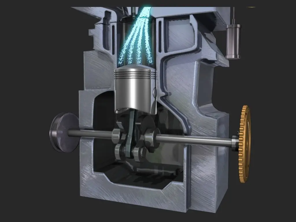 Animated:intake stroke,compression stroke,power stroke,exhaust stroke.