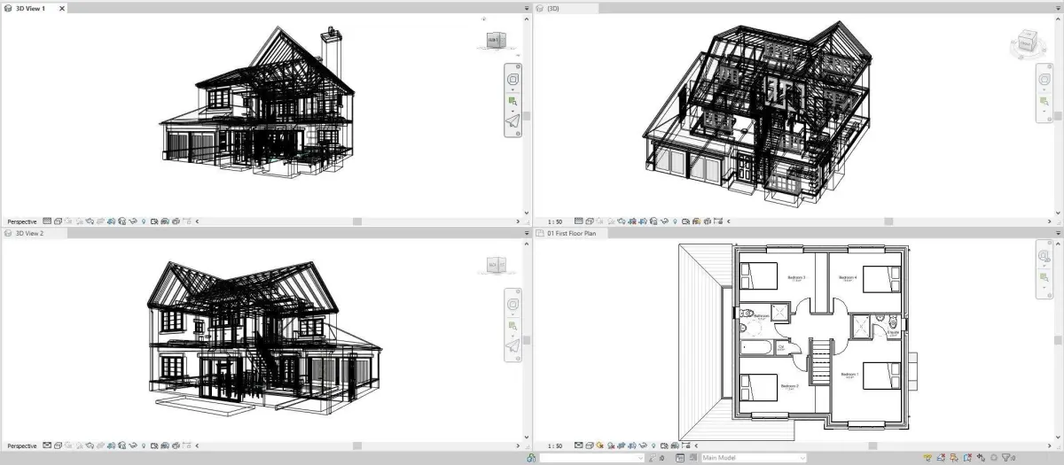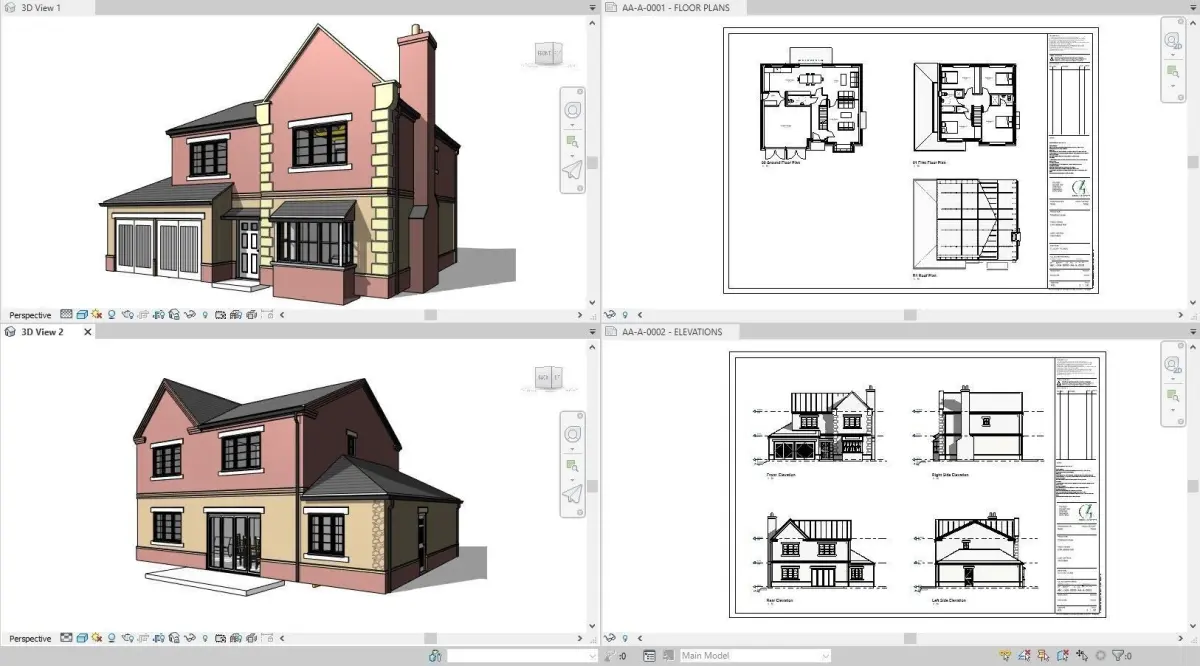 3D Revit / BIM model of a traditional English detached house which has 4 bedrooms and a double internal garage. Model in Revit 2020 with floor plans and elevations and sections are ready.
