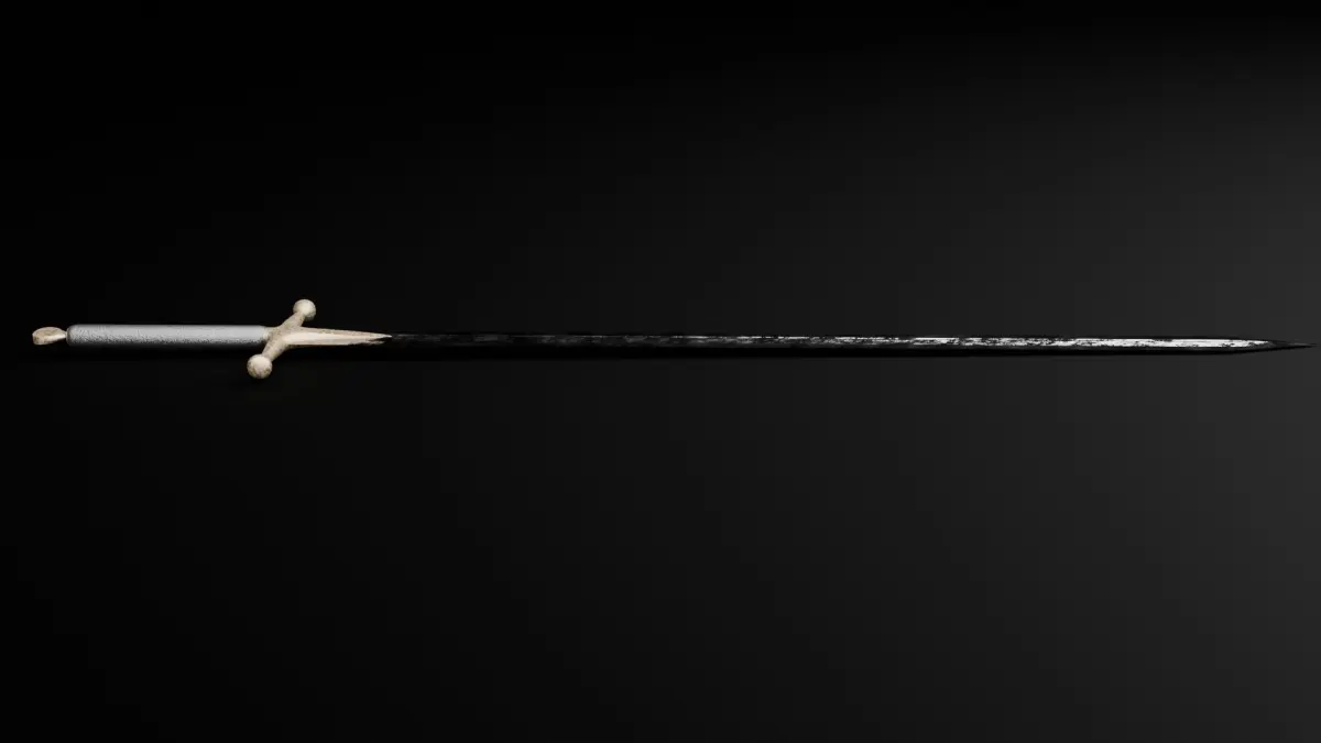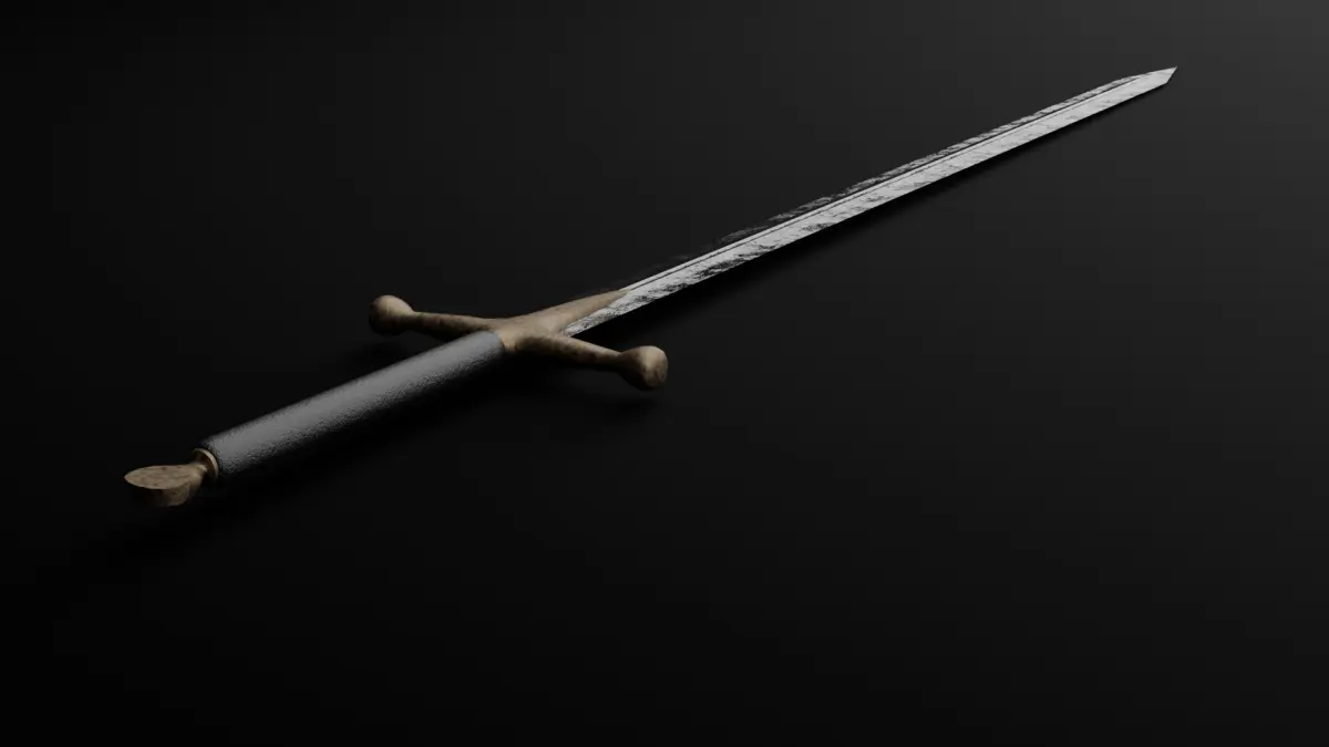English Longsword.Approximately 1.7 meters.One and a half handedness.Highly realistic, made for CGI/VFX.Blade and hilt are weathered.Black leather.Materials are made in Blender using nodes.UV unwrapped with smart UV projection.Two change the degree of worn roughness of the steel, go to the shading editor and scale down the scale attribute in the bump node.If you have custom sword requests or any requests, please message me.