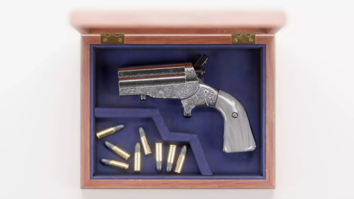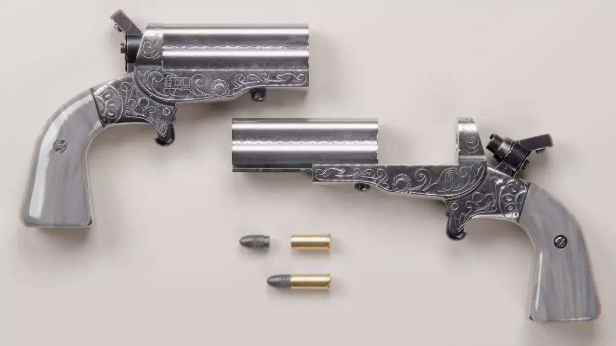 HJS Frontier Four .22 caliber derringer with an engraved stainless steel barrel and frame and a pearl grip.