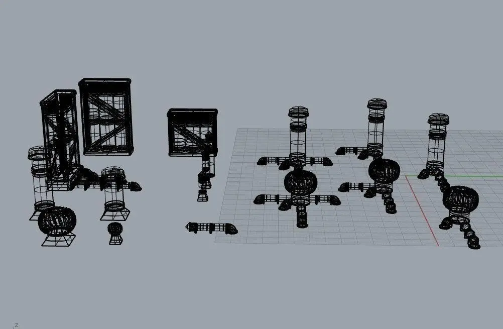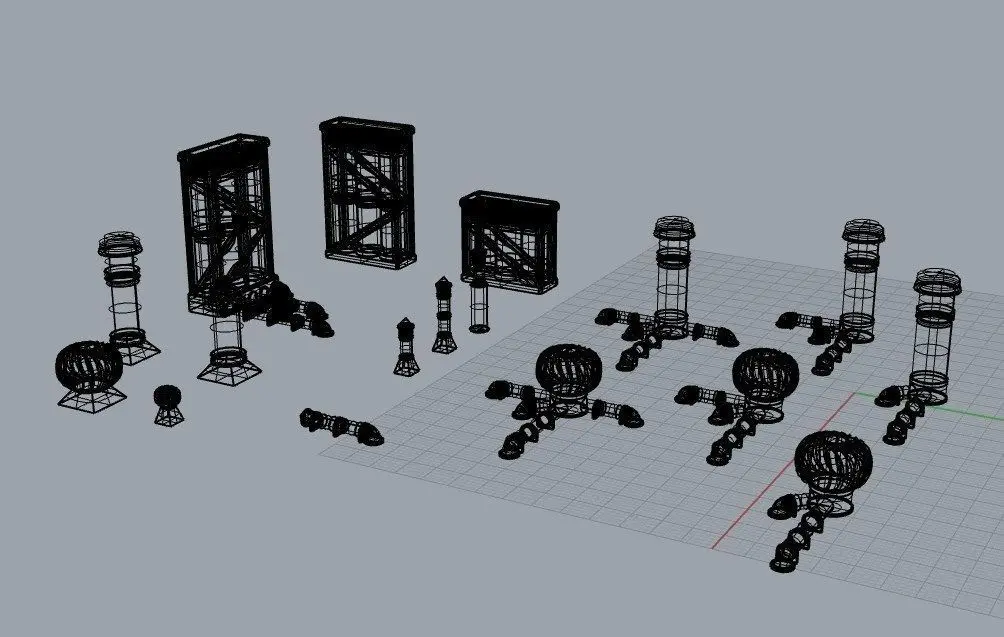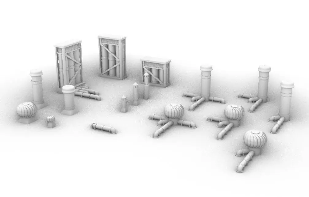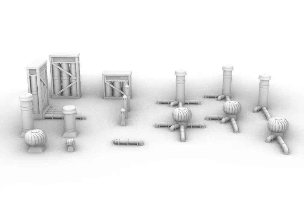 Enhanced chimney pack for tabletop miniature sceneries, dioramas and low poly gaming, design, animation. Inspired by 80's-90's rooftop elements, these pieces designed for industrial and residental units. Includes 17 types of rooftop equipment, straight piping, with pointy and round rain shields, collector units with spinners and large exhausts with single and triple feeds. Ideal for modern, interwar and scifi settings over plastic, paper and cardboard sceneries.