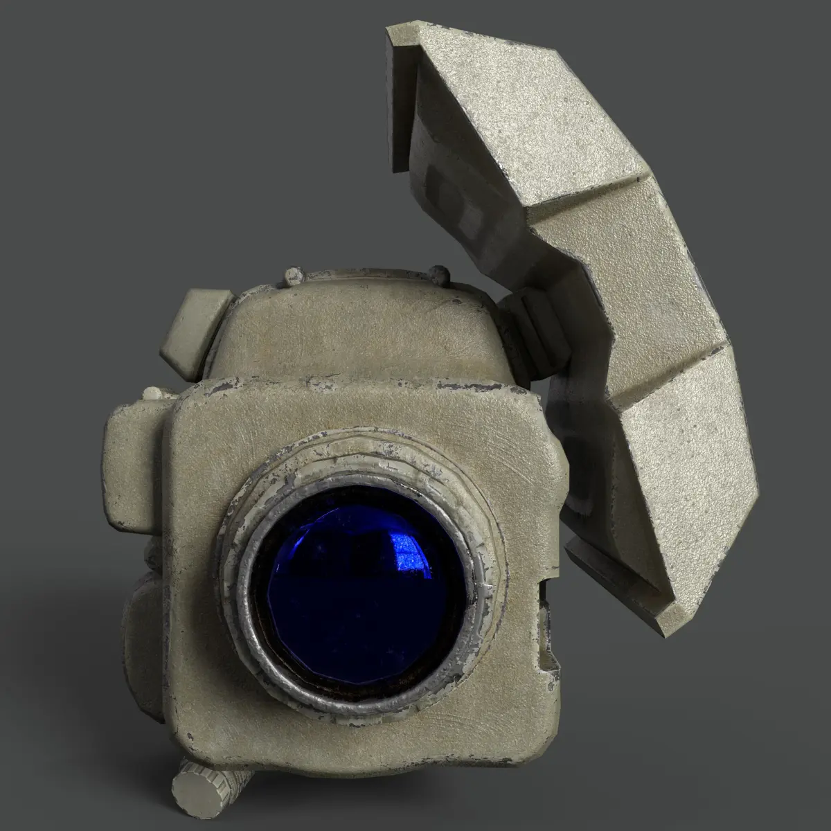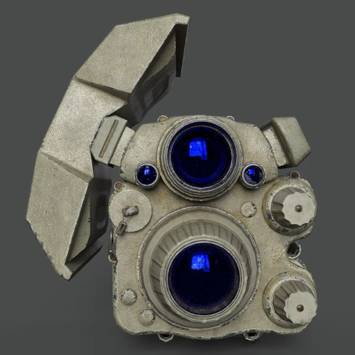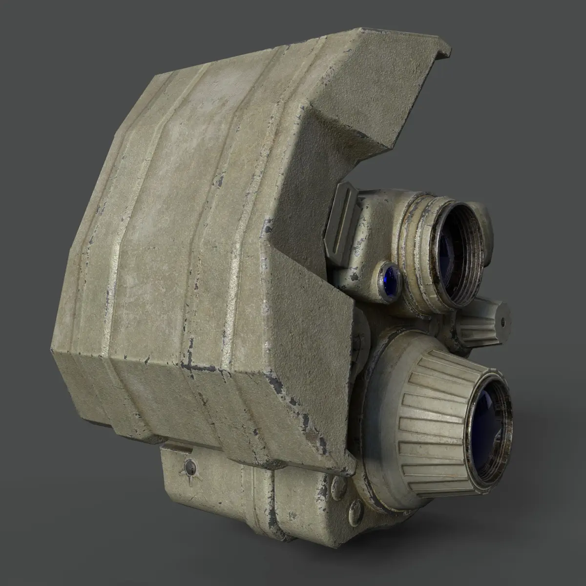 This is a high-detail 3D model of a tactical military-grade laser aiming module, typically mounted on firearms for precision targeting. The model showcases a realistic and rugged design, featuring multiple lenses, dials, and ports that mimic the functionality of infrared illuminators and laser pointers. The textures are weathered and worn, giving it a used, battle-ready appearance. The blue-tinted lenses and intricate mechanical details add a high level of realism. Ideal for use in FPS games, military simulations, or cinematic scenes requiring authentic weapon attachments.