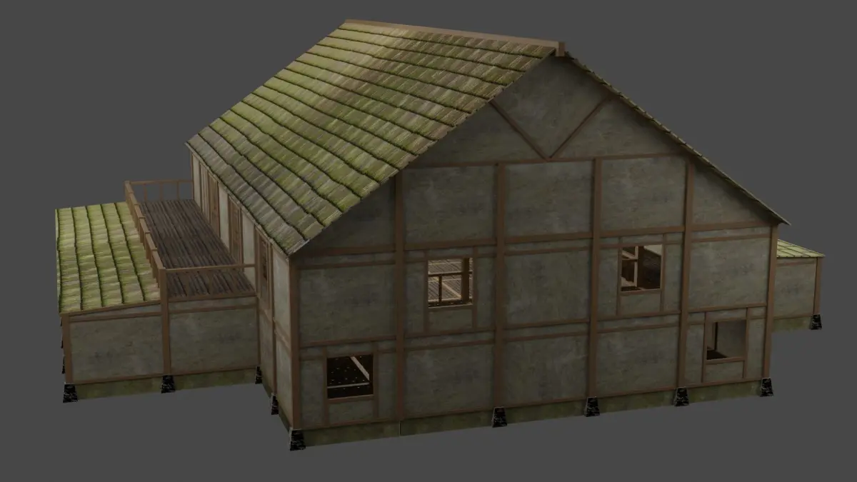 10 medieval Buildings with interiors and stairs to the second floor They all use the same material witch is composed of 9 textures no need for uv unwraping9 of the 10 have between 842 and 1768 faces and the large bulding is 4860 facesDoors are not rigged or animated