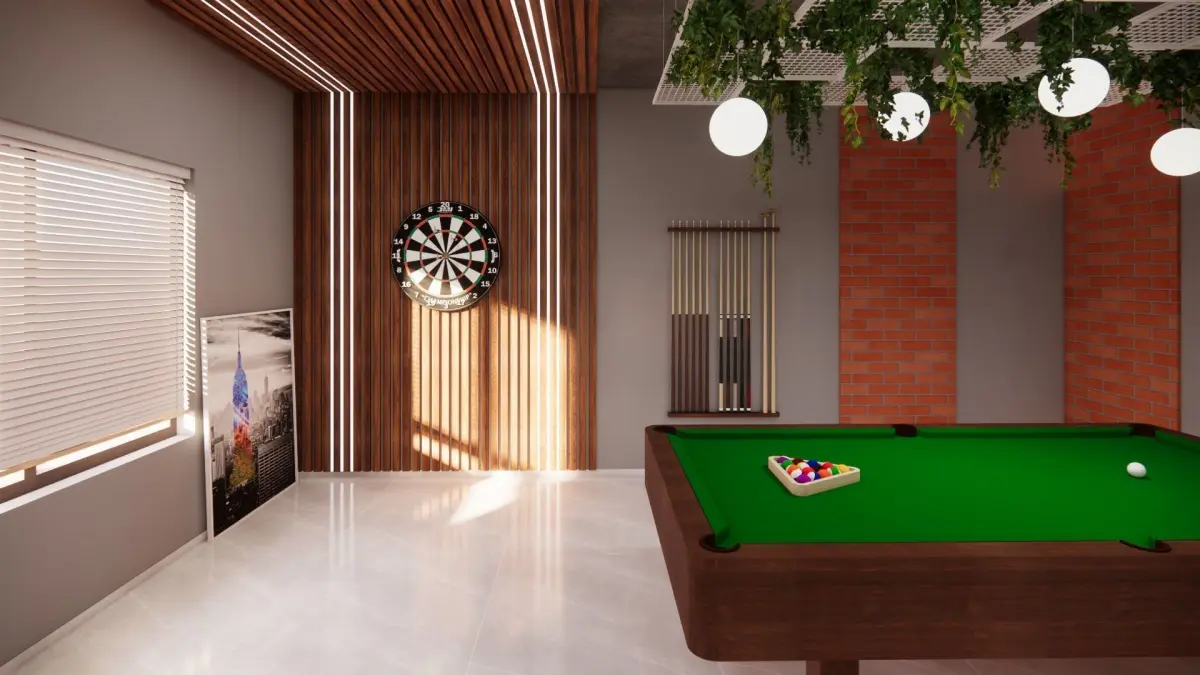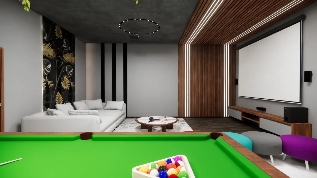 A Complete Entertainment room with games and home theatre all in one room. A long couch for a comfortable movie experience, a dart game for fun and a pool table with a beautiful hanging ceiling with plants and lights. All visible artefacts and furniture are included in the file. All materials used are also present.
