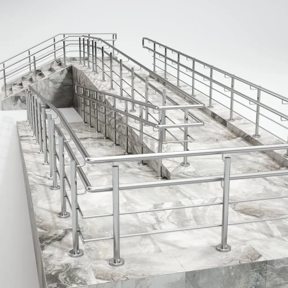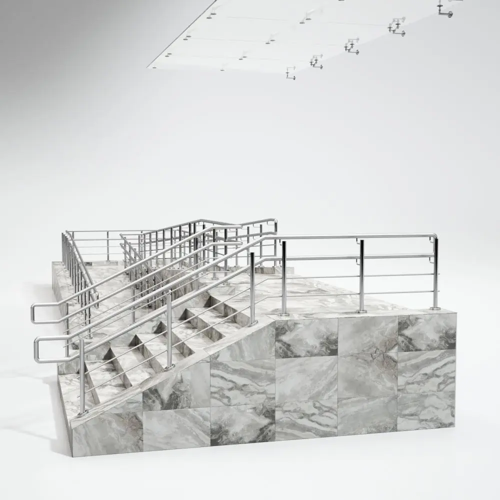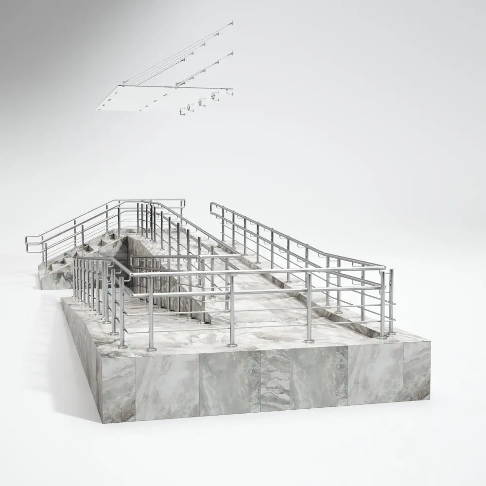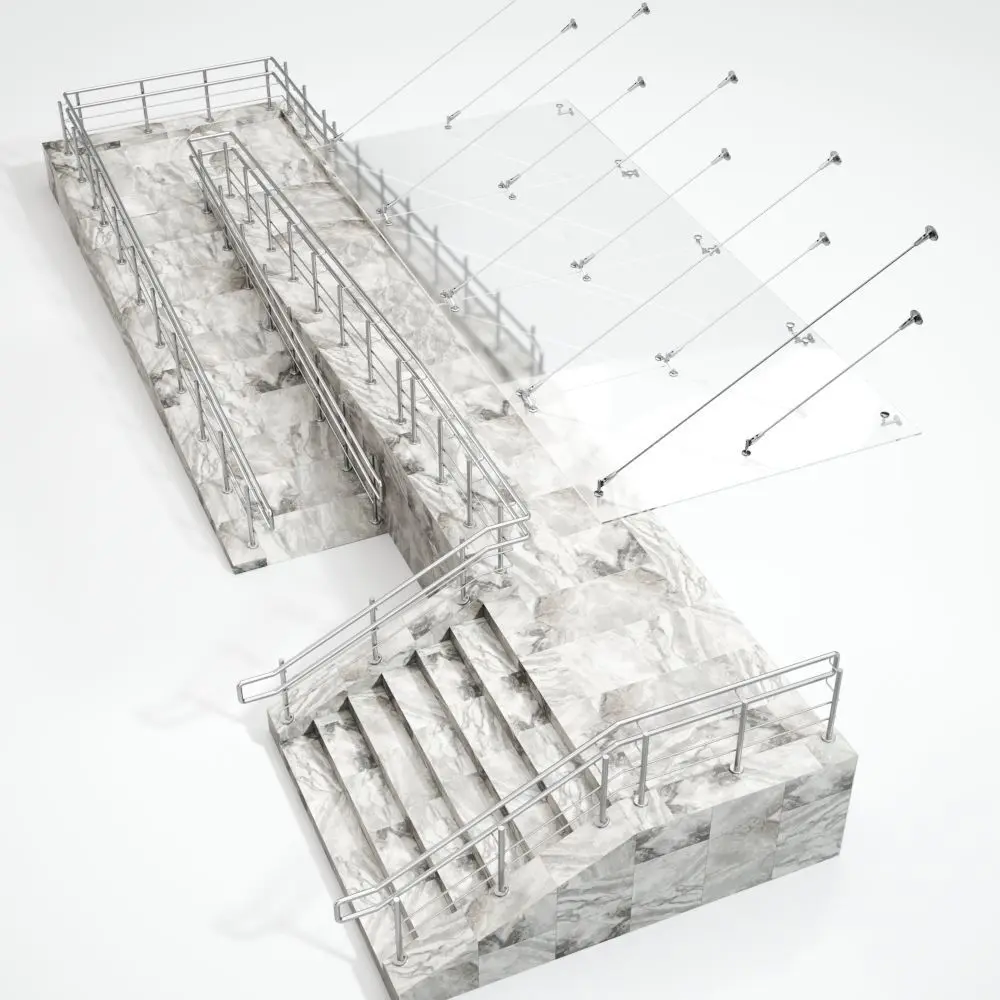 Entrance stair with ramp. Concrete constructructure with marble tile. Stainless steel railing included. Glass visor included.No lights, no cameras.Supermarket, hospital or other public building entrance.