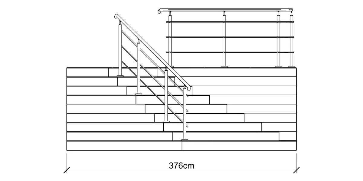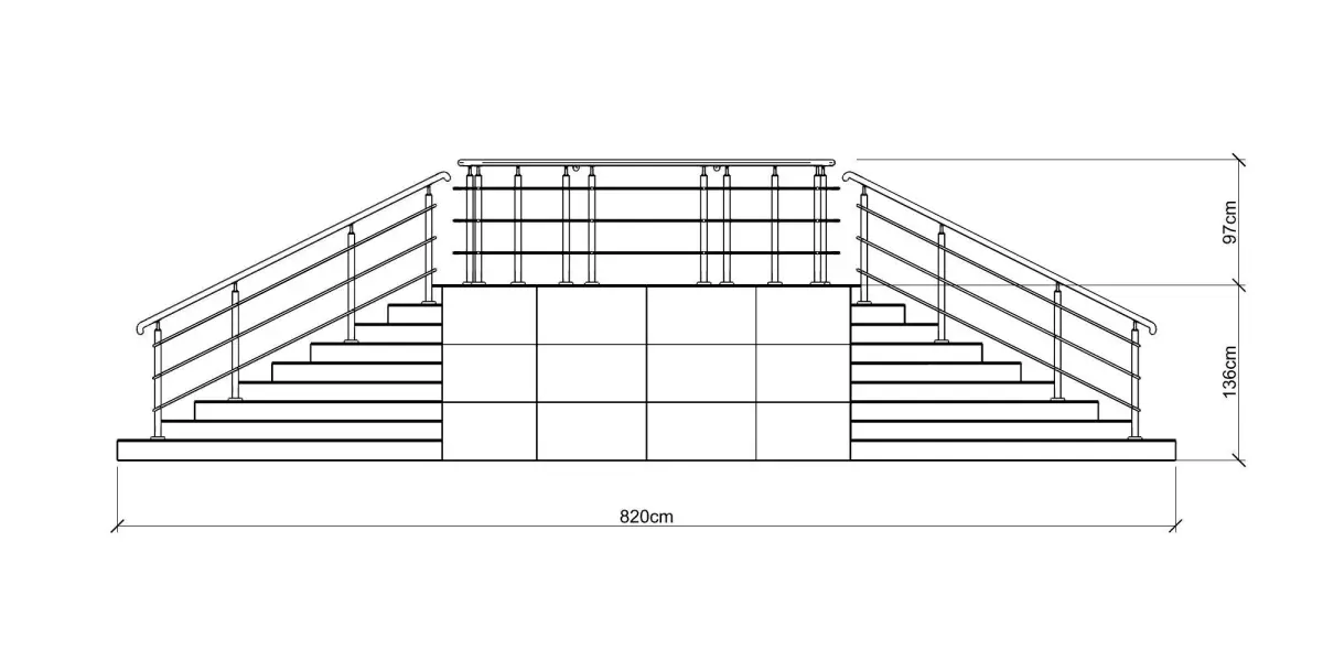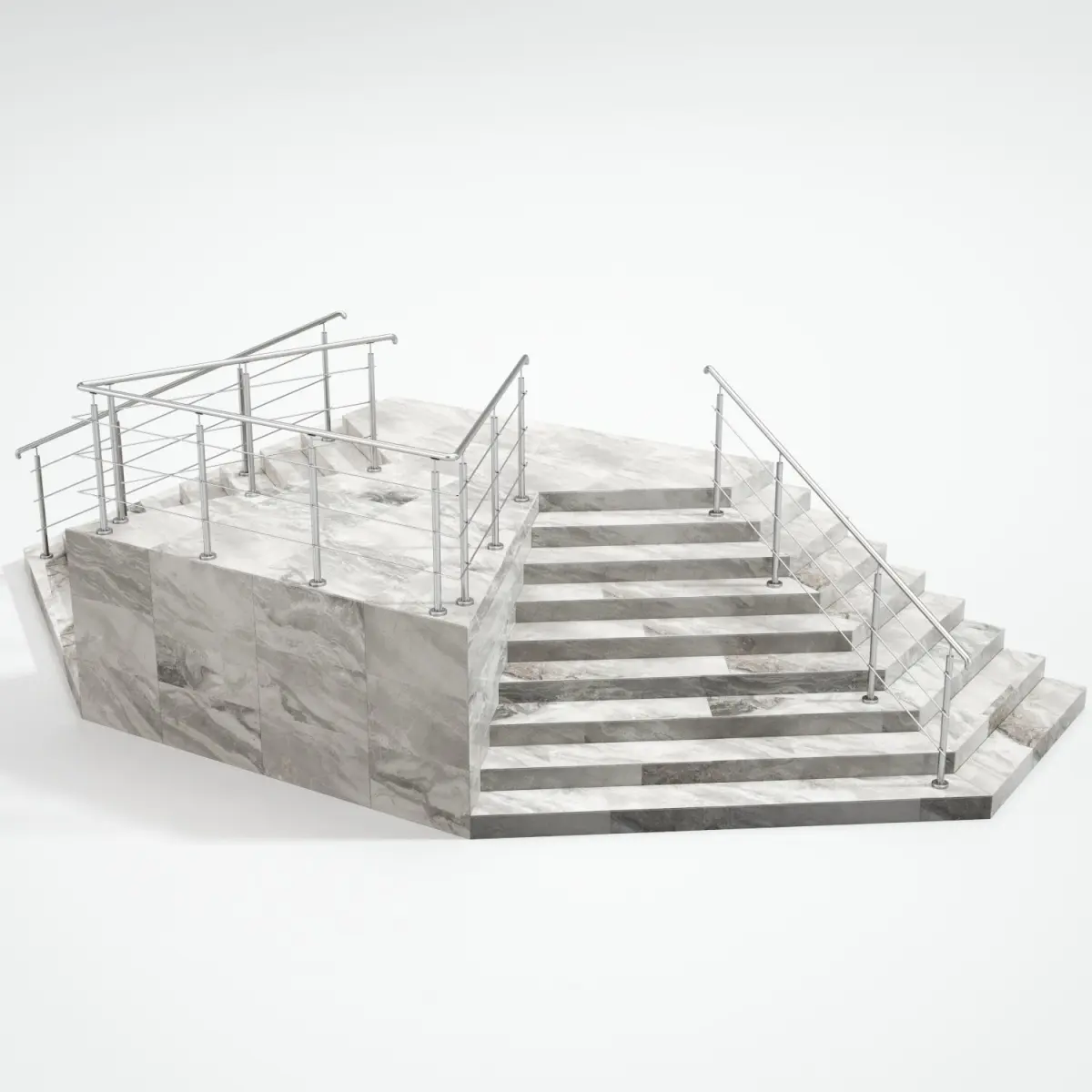 Entrance stairs. Concrete constructructure with marble tile. Stainless steel railing included.