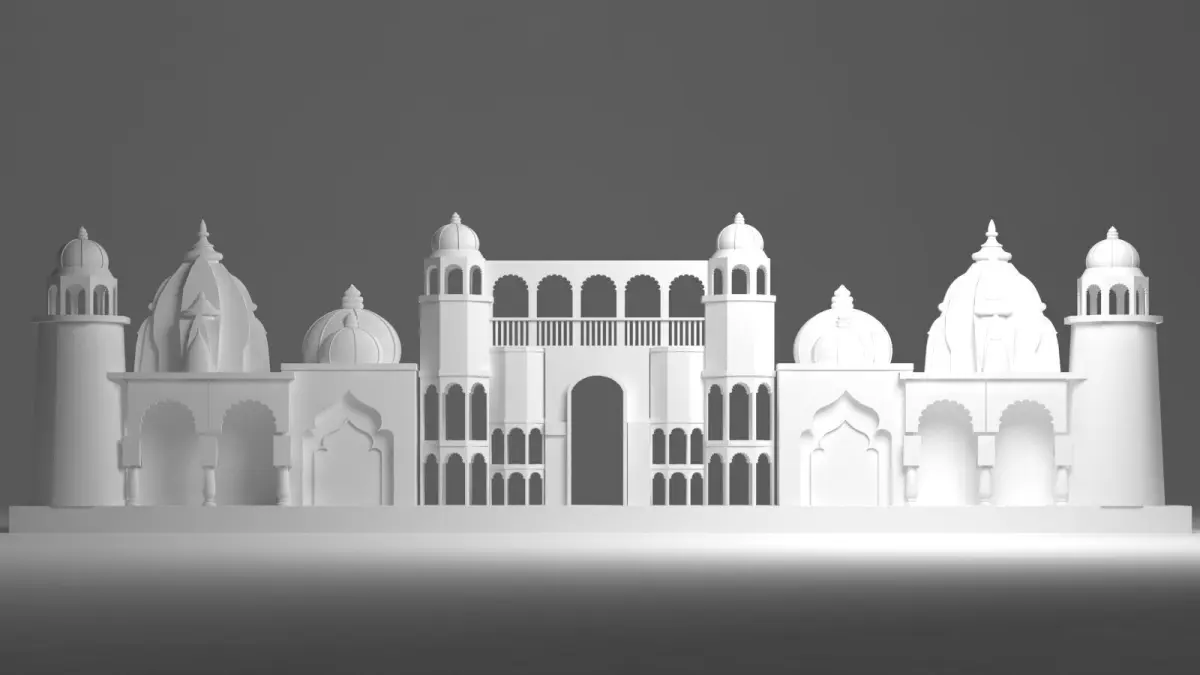 This 3D model features an elegant entry gate facade designed with classical architectural elements, blending traditional aesthetics with detailed structural accuracy. The central highlight of the facade is a grand arched entrance, supported by symmetrically aligned columns or pilasters, exuding a sense of regal welcome. Rising above the arch is a prominent dome, adding a touch of majesty and grandeur, inspired by Indo-Islamic or Mughal architecture (customizable depending on your region/style).