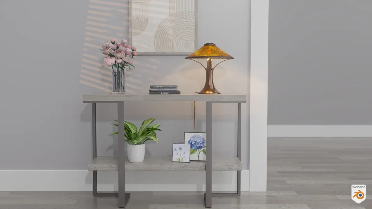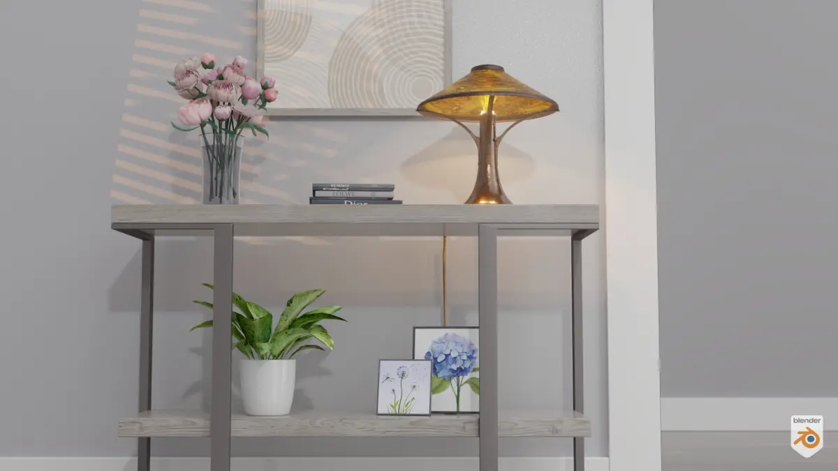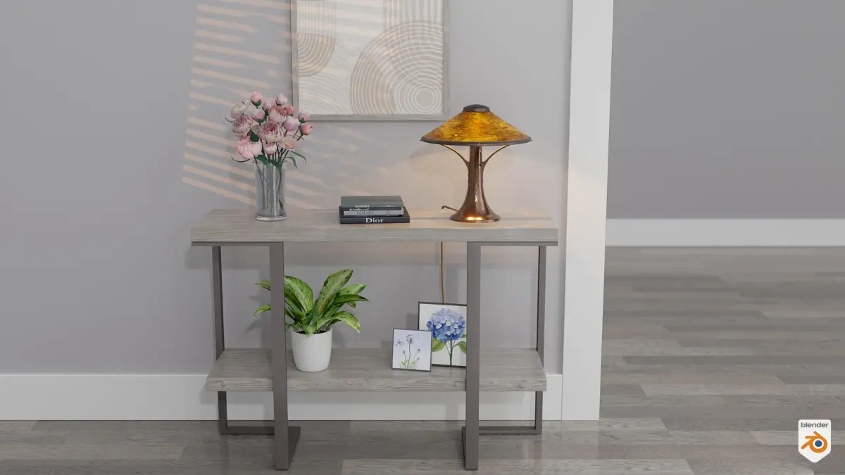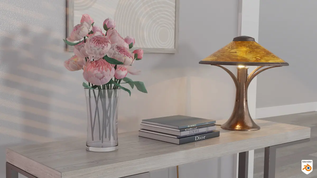 Unique and modern table with modern industrial lamp, peonys in vase, philodendron, books, and custom artwork as shown.Artwork is unique and created from iPad and Procreate.4K UV maps by model or part. Some smaller model textures are not 4K.