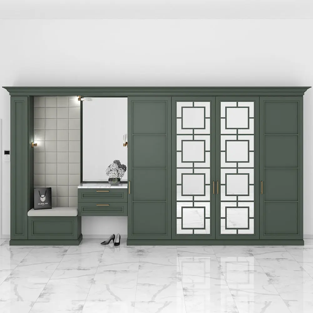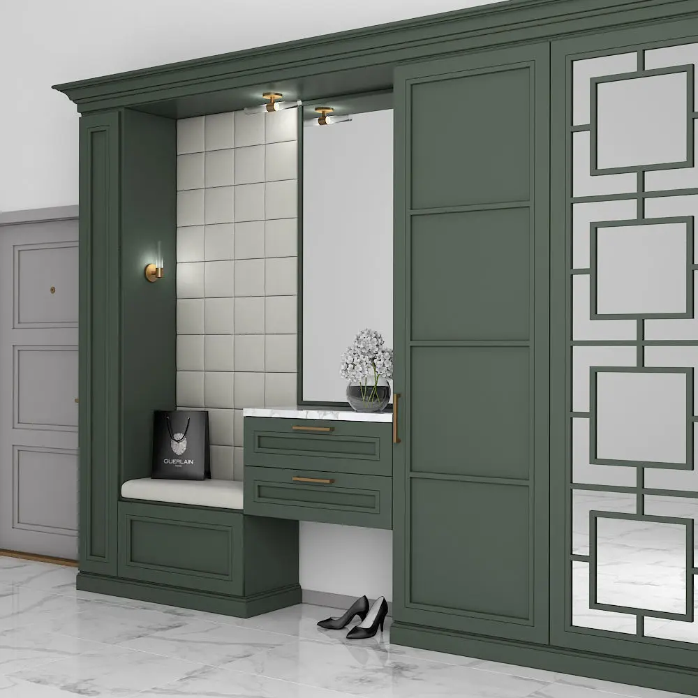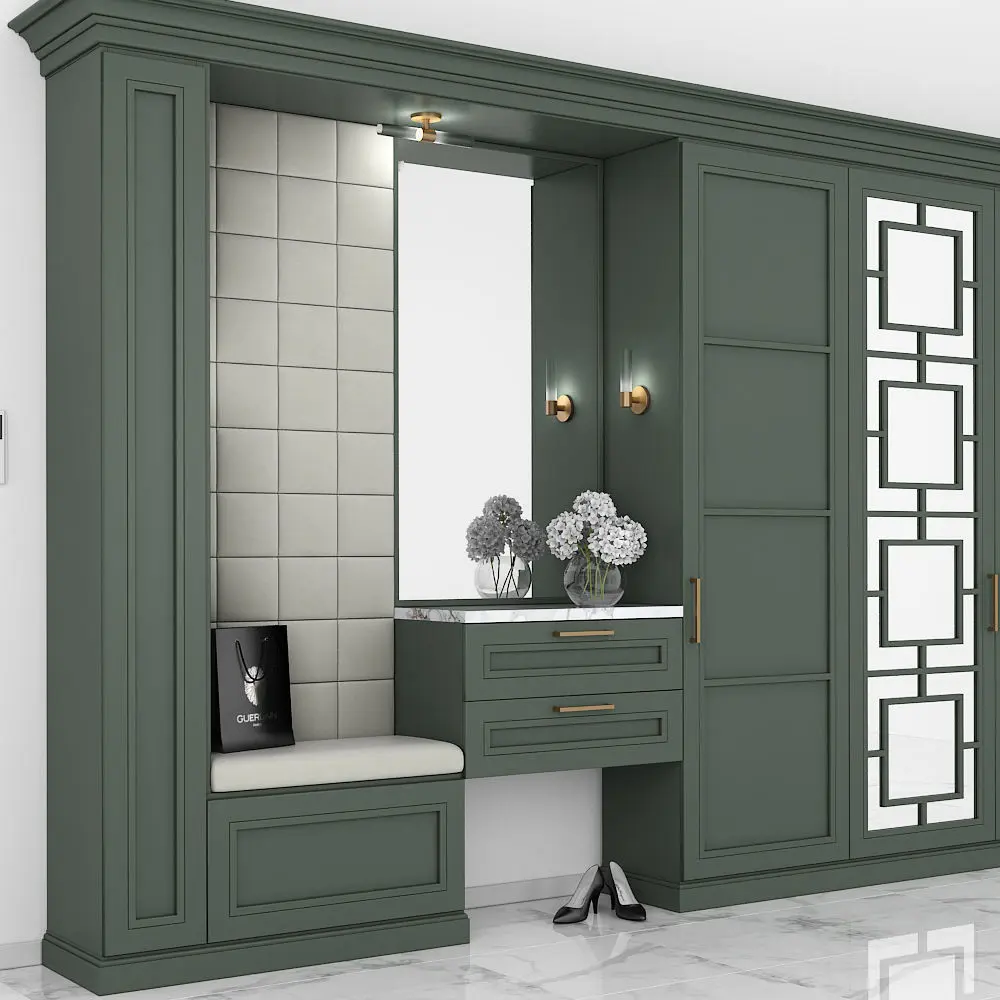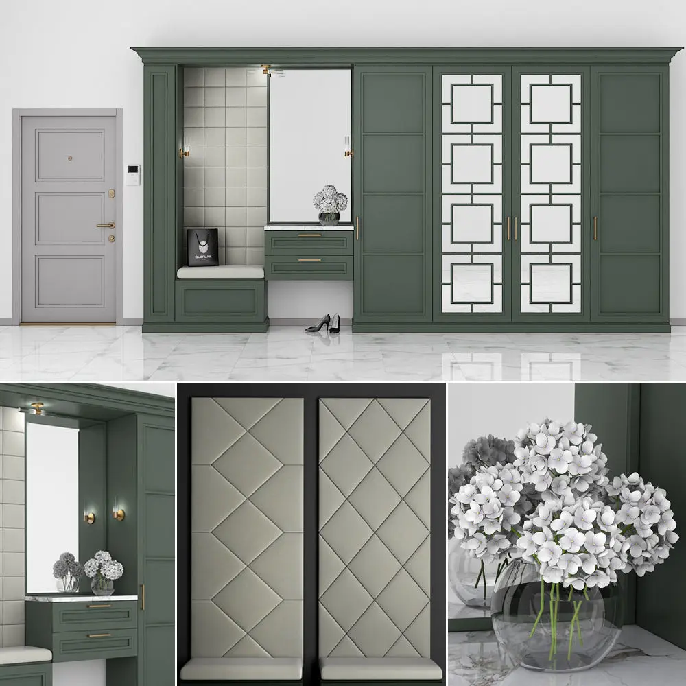 Furniture composition for the hallway or bedroom. Furniture composition consists of separate grouped modules for easy editing. Units: Millimeters Dimension: 5000 (W) x2700 (H) x 450 (D) mm Render: V-Ray 2,20 Formats: 3ds Max 2010, FBX
