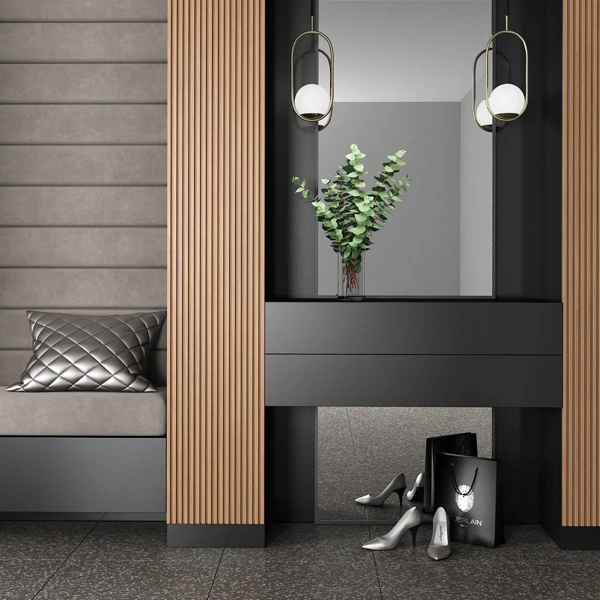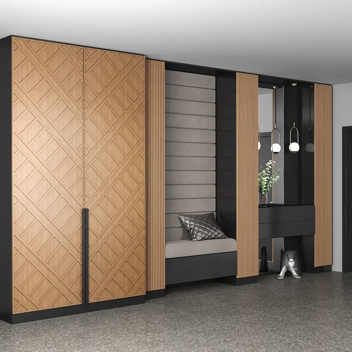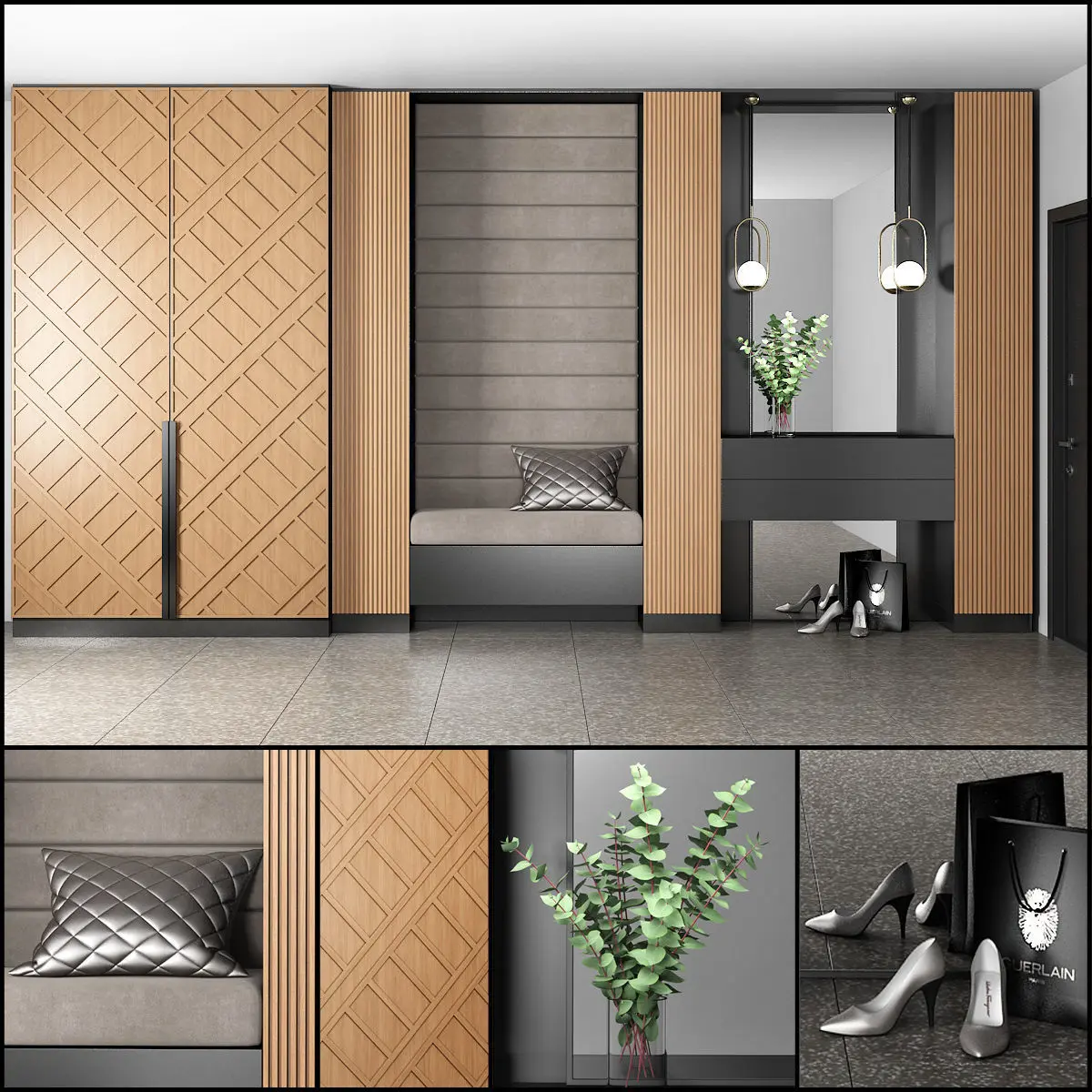 Furniture composition for the hallway or bedroom. Furniture composition consists of separate grouped modules for easy editing. Units: Millimeters Dimension: 5200 (W) x 2800 (H) mm Render: V-Ray 2,20 Formats: 3ds Max 2010, FBX