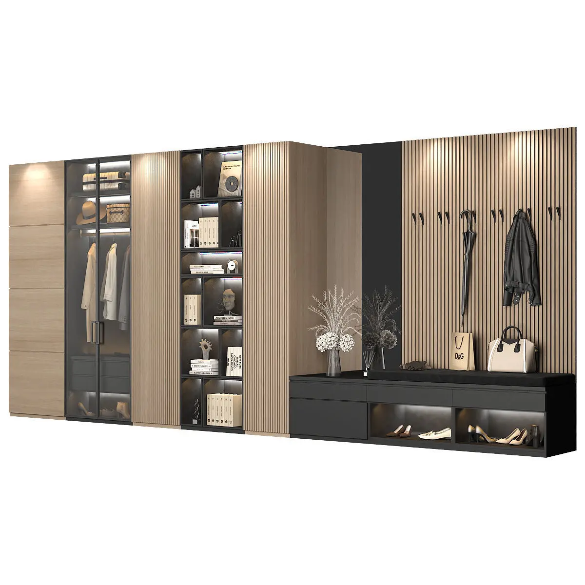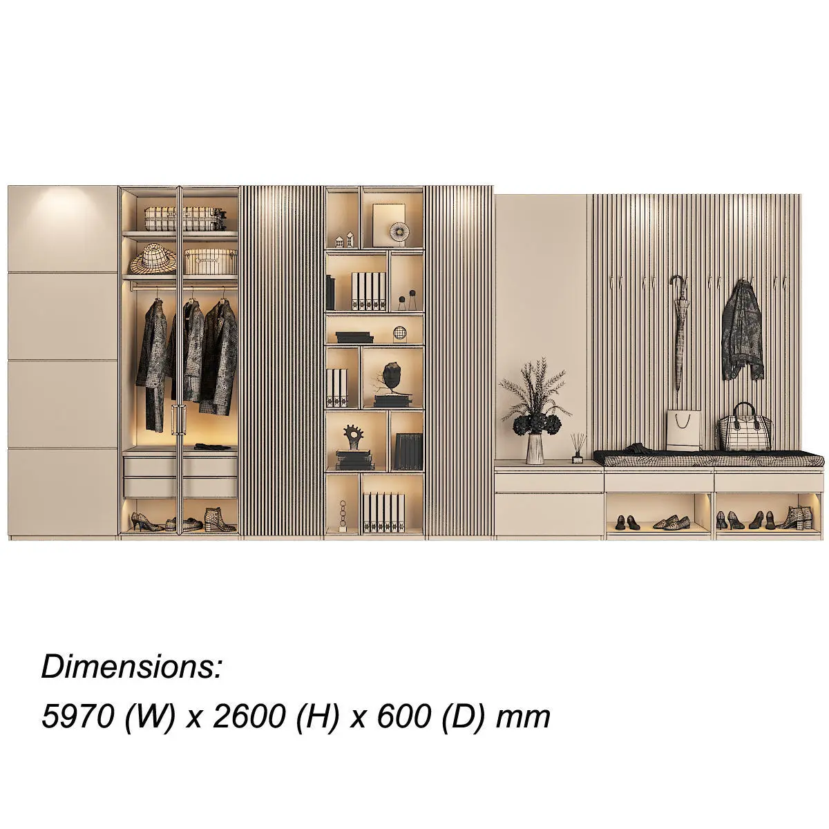 Furniture compositionDimensions: 5970 (W) x 2600 (H) x 600 (D) mmThe furniture composition consists of separate grouped modules for easy editing.Render: V-Ray 2,20 Formats: 3ds Max 2010, FBX