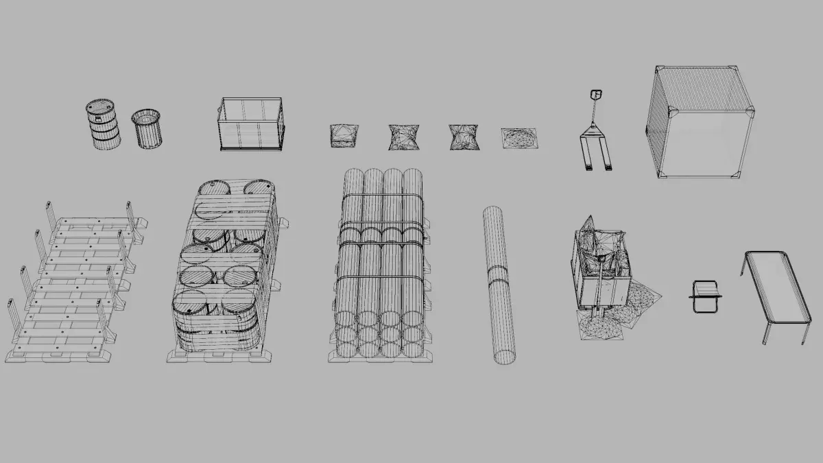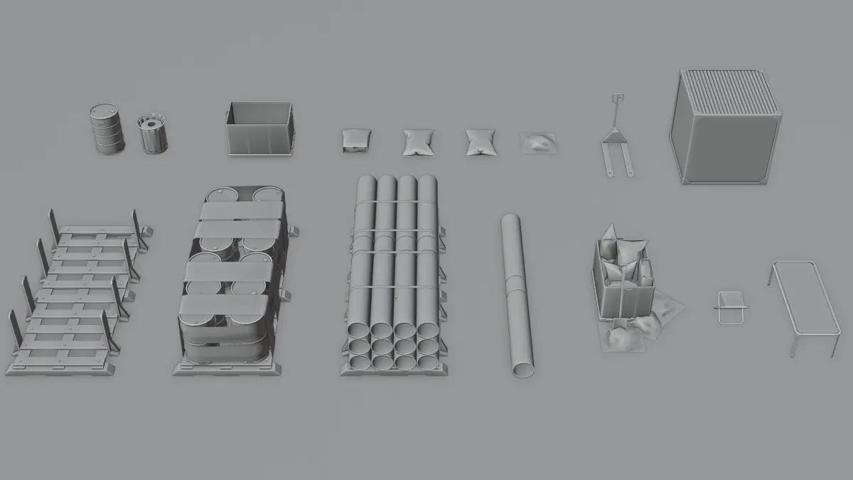 4 cements, 1 lootbox, 1 cart, 1 hand pallet truck, 1 pallet, 1stool, 1 stretcher, 1 oil barrel, 1 concrete pipe, 1 concrete pipe load, 1 oil barrel load, 1 shovel, 1 garbage can, 1 cement load cart