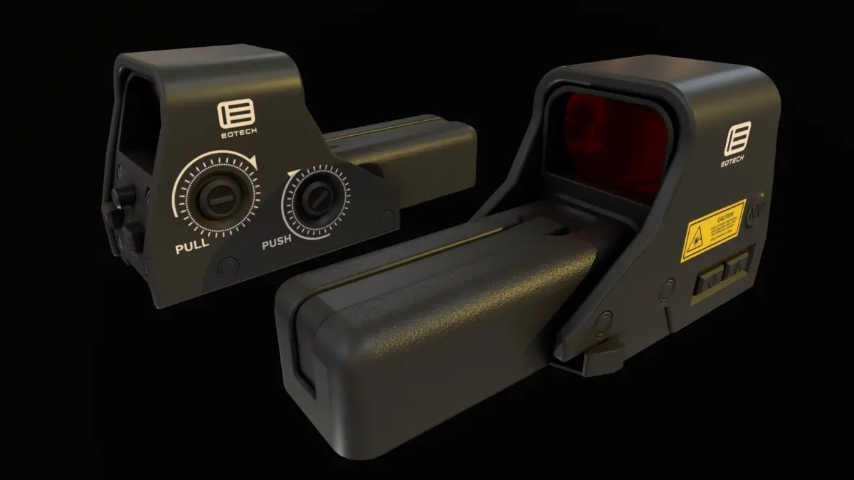 This Asset suitable for games and real-time rendering engines. Weapons Attachment EOTech 518 Holographic it's good for game performance, comes with Textures and Substance Painter Project. The model comes with diffuse(albedo), roughness, metallic, normal, and AO maps with 2048x2048 resolution in png format. Normals and AO maps were baked from the hi-poly model, it making this model look very detailed without using many polygons. Also included a Substance Painter project (.spp file). Renders and wireframes were done using Marmoset Toolbag 4. Bare in mind that PBR materials to work properly need proper lighting and material setup. It is Done with the Metal Roughness workflow. One 2k Texture Set for every Part.