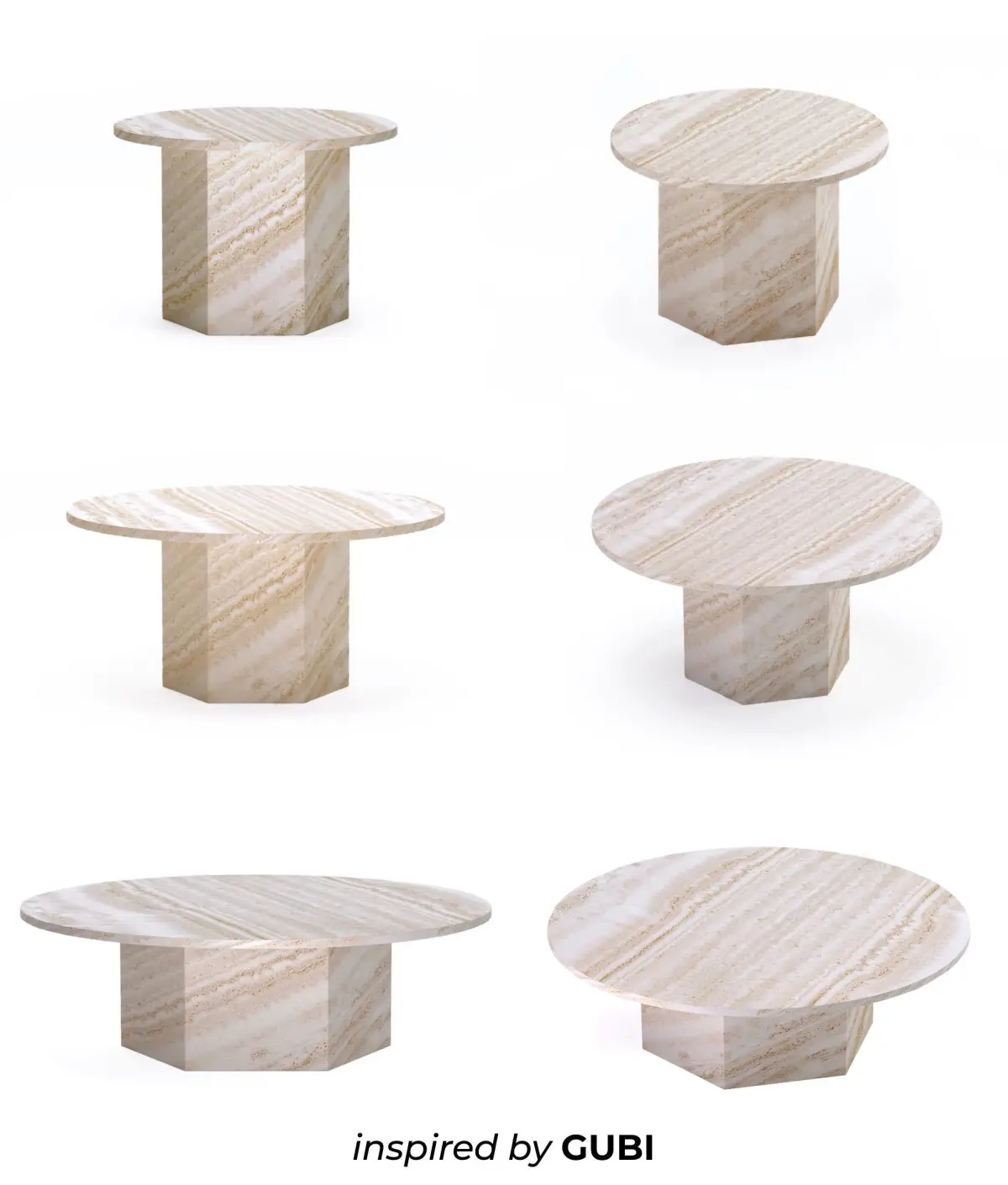 - Epic Coffee Table by GUBI white treventin d-1100mm2.Epic Coffee Table by GUBI white treventin d-800mm3.Epic Side Table by GUBI white treventin d-600mm