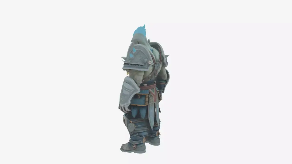 This formidable 3D model captures a chilling orc death knight from World of Warcraft, rendered in exquisite detail across multiple views for seamless modeling. His frozen, icy green flesh gleams with an otherworldly pallor, etched by jagged rune scars that pulse with necrotic energy. Piercing, glowing icy blue eyes stare out from a shaved head crowned by sharp frost spikes, while his tusks are rimed with crystalline ice, evoking an aura of unrelenting winter. Enveloped in heavy saronite plate armor, adorned with intricate death runes and weathered dents from countless battles, he bears massive pauldrons that broaden his menacing silhouette. A formidable runeblade is strapped across his broad back, its edge shimmering with frost. He wields a frost-enchanted axe in a dynamic pose, the weapon's surface encrusted with delicate ice crystals that catch the light. Spiked boots ground his imposing stance, every element—from the engravings on his armor to the subtle frost effects on metal and skin—meticulously crafted for high-fidelity 3D reconstruction, isolated against a pristine white backdrop without shadows or distractions.