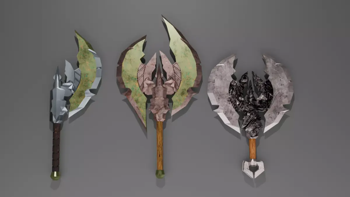 Materials: The set includes high-fidelity textures for weathered wood, oxidized metals, and stone-like blade surfaces. The PBR workflow ensures that light interacts naturally with the rough wood grains and the sharp, metallic edges of the blades.