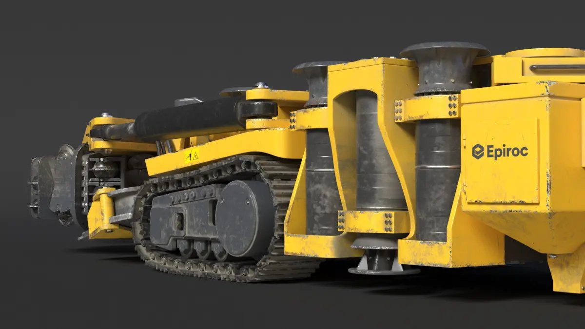 Epiroc Mobile Miner is a three-dimensional model of large underground mechanical rock excavation and tunnel boring vehicle (type mobile cutting miner or mine tunnel excavator machine).
