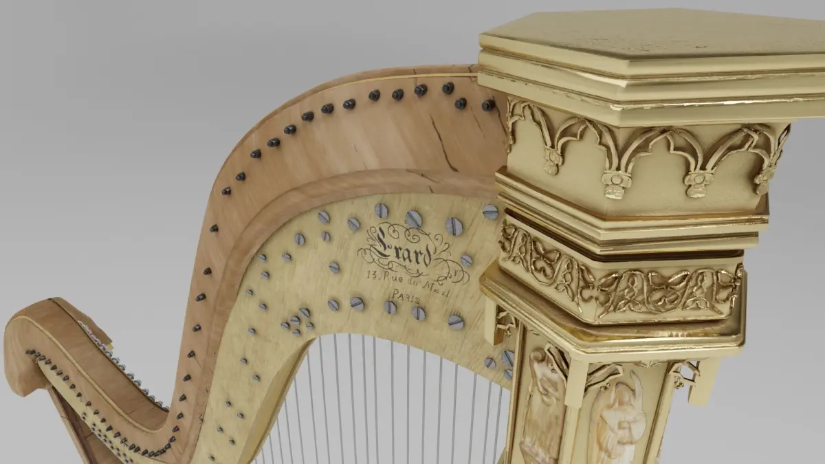 This is a high poly model of a 'NEO-GOTHICAL PARCEL GILT ANTIQUE WOODEN HARP,' made by Érard. The model is highly accurate with a nearly seamless texture map (with only slight overlapping). The faces are triangulated in these formats. Textures are accurate to the real Erard harp, which includes the signature 'ERARD 13, Rue du Mail A PARIS' located on the neck of the harp.