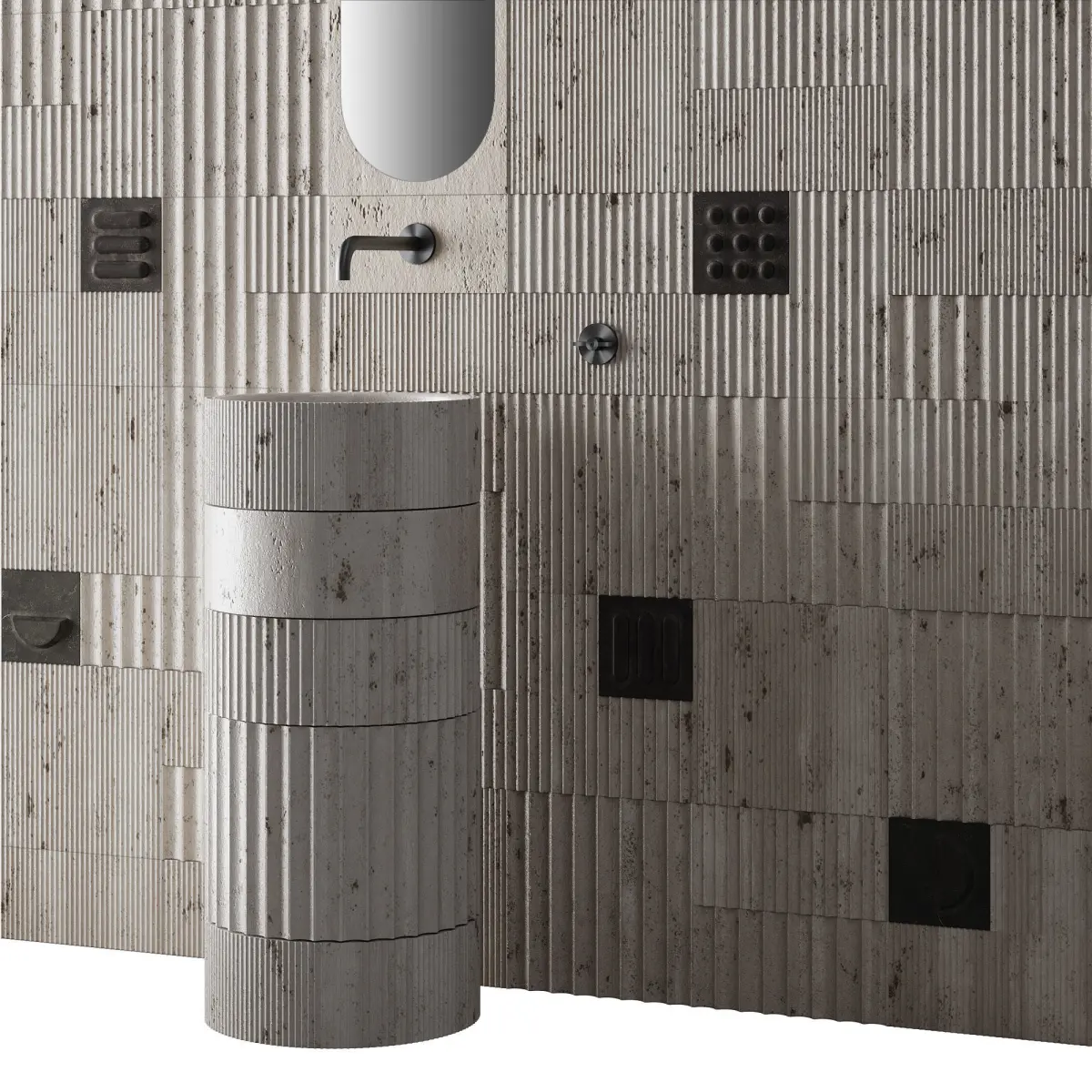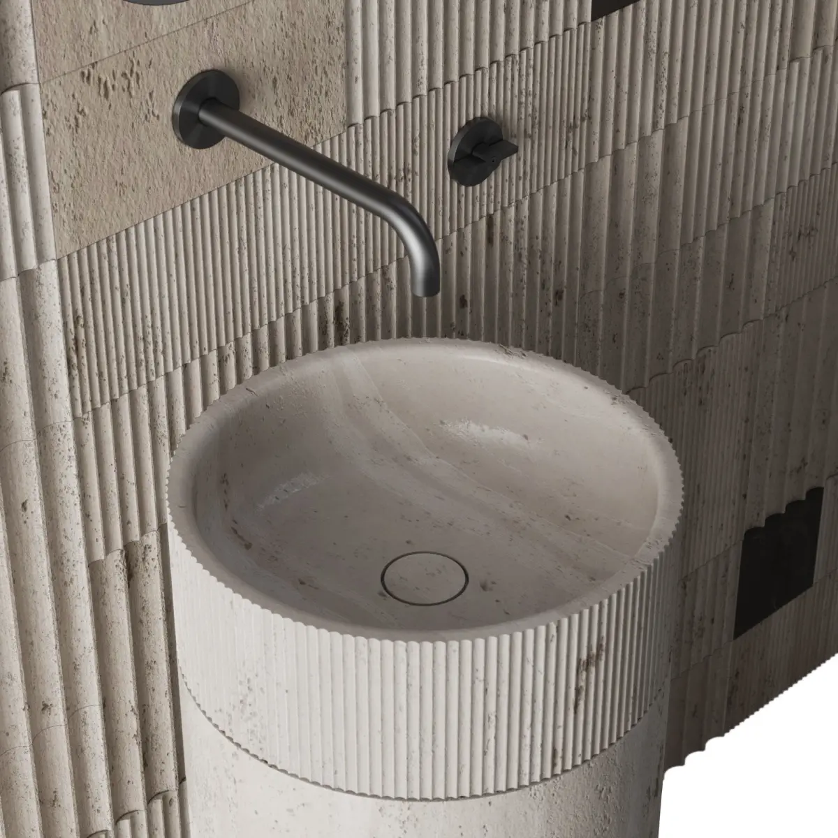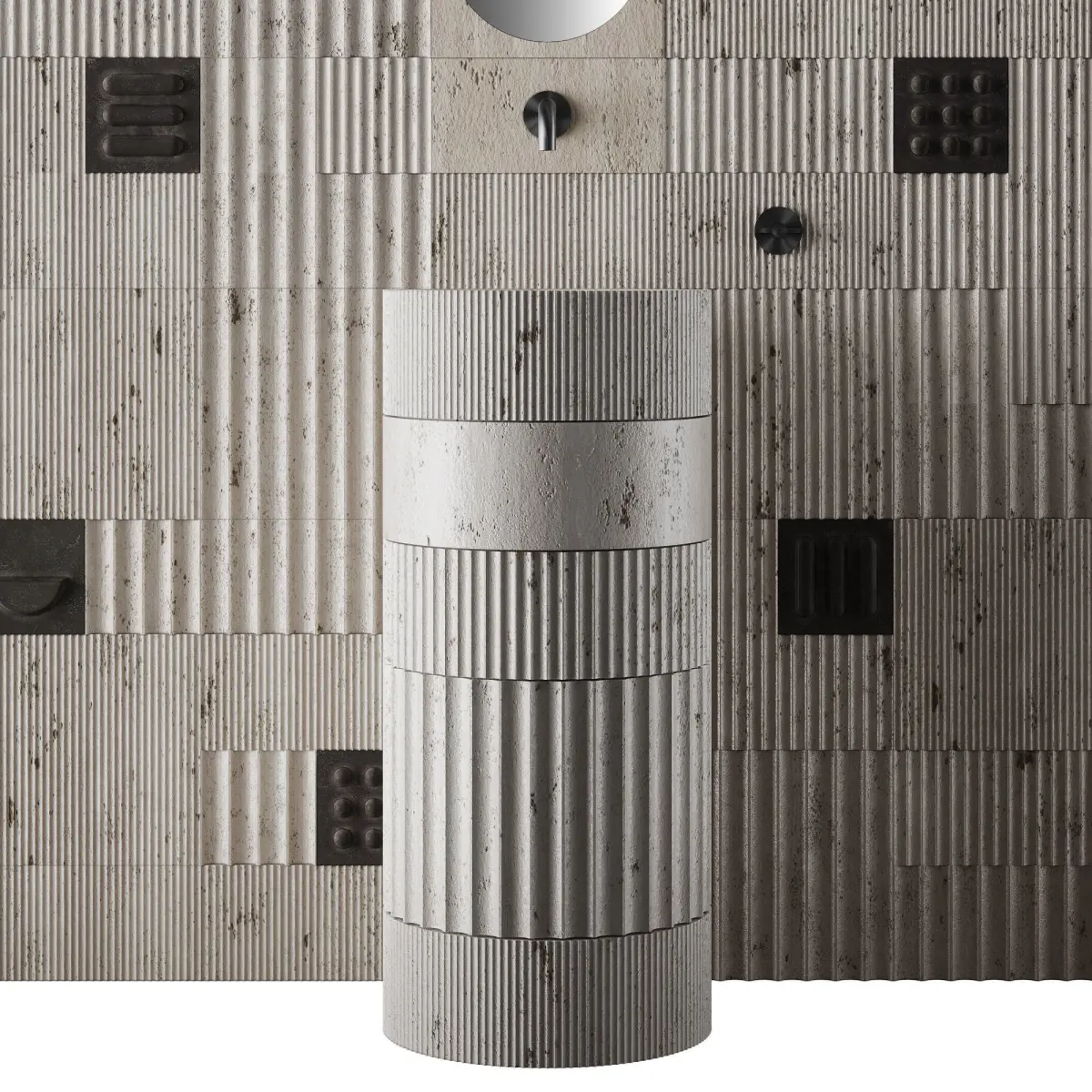 Travertine floor-standing washbasin made of 5 types of modules-cylinders ø350xh150mm, ø350xh300mm, different engraving density or its absence.