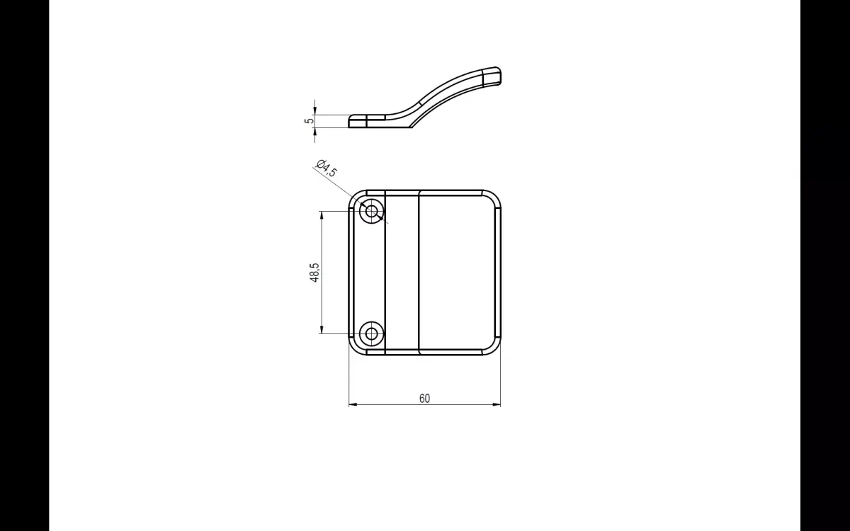 Total width: 60 mmHole diameter: Ø4.5 mmMounting hole spacing: 48.5 mm (center to center)Thickness: 5 mm