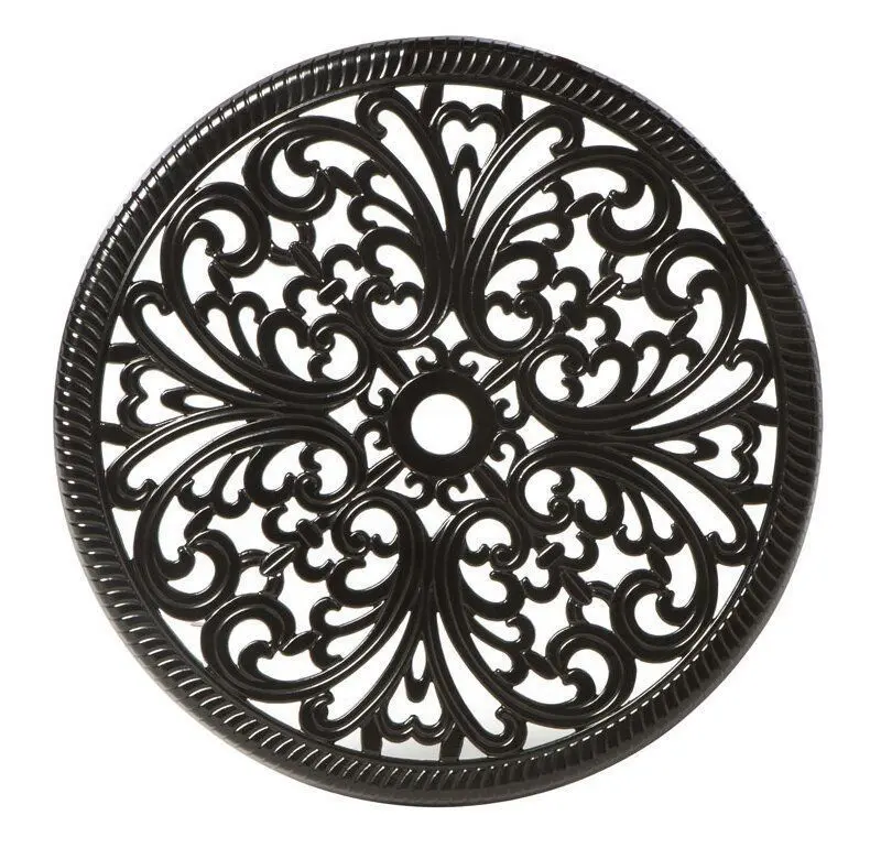 - Lend your outdoor ensemble a splash of European elegance with this chic three-piece bistro set. Made from cast aluminum in a weather-resistant, powder-coated finish, this circular cafe table showcases a swirling scrollwork motif with floral accents and fleur-de-lis detailing, while each chair strikes a classic