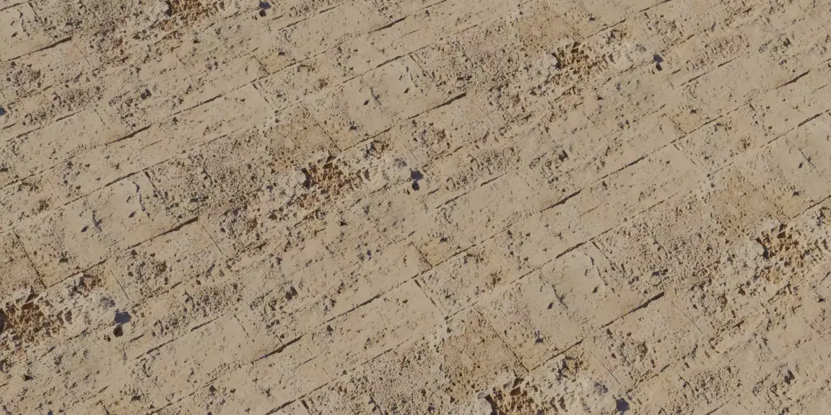 A seamless, tileable sandstone ashlar PBR texture featuring warm beige blocks with heavy granular erosion, pockmarks, and spalled patches revealing friable stone grain for a sun‑worn heritage look. Delivered as calibrated 4K maps—Base Color, Normal, Roughness, Ambient Occlusion, and Height/Displacement—optimized for shadow‑free PBR in Blender, Unreal Engine, Unity HDRP/URP, 3ds Max, Maya, and Substance tools. The height map enables parallax or tessellation to push block relief, chipped edges, and pitted cavities, while tuned roughness captures chalky, dusty mineral micro‑glints with slightly smoother weathered planes. UV‑friendly and non‑directional, it tiles cleanly for forts, temples, courtyards, desert cities, and fantasy keeps; pairs well with decals like cracks, leaks, soot, sand drifts, and moss in damp areas. Optimized PNG/TIFF with clear naming and suggested normal/displacement strengths for quick setup across engines; licensed for games, films, ArchViz, and promotional renders.