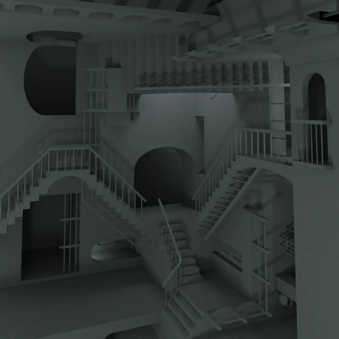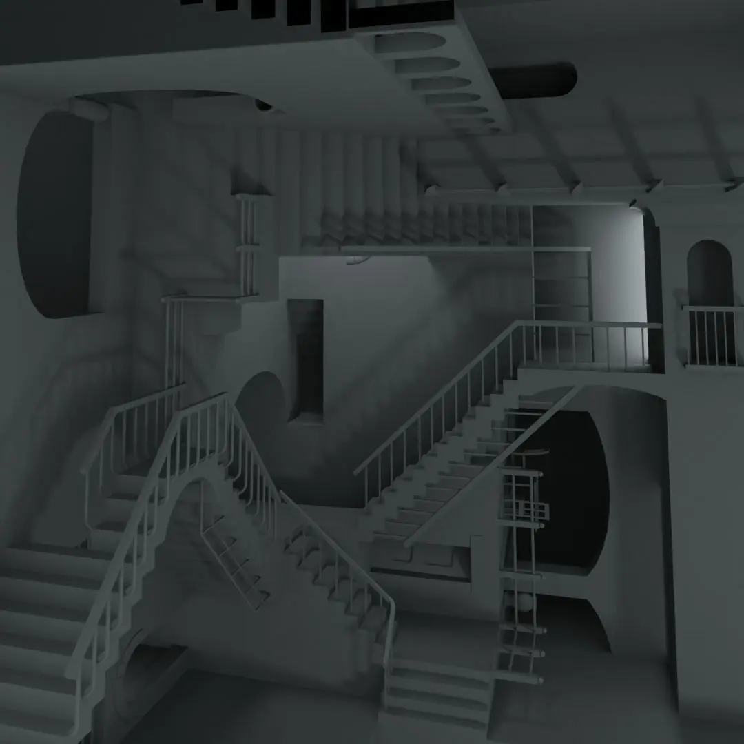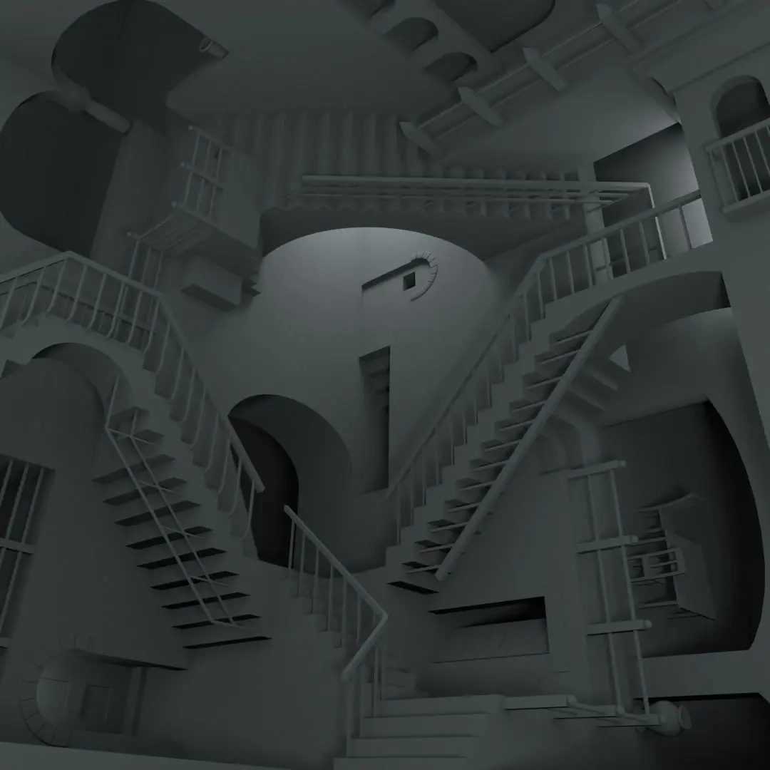 3D representation of the lithograph Relativity by M.C. Escher. Modeled and rendered in Blender 3D, with procedural texturing.
