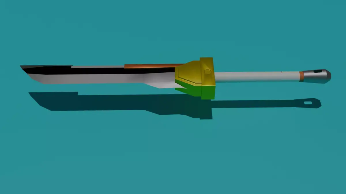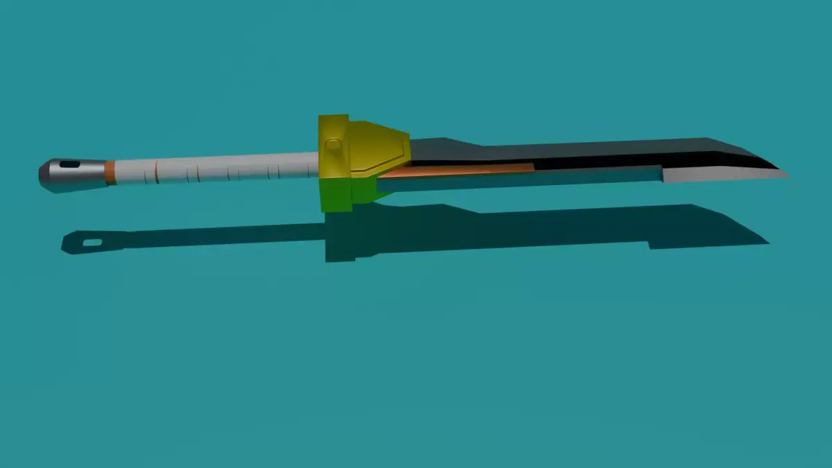 Esta espada presenta un diseño simple y robusto, con una hoja ancha de líneas rectas y un filo oscuro que resalta sobre el fondo claro del material. El guardamanos es de color dorado, con formas geométricas sencillas que le dan un toque llamativo pese a su simplicidad. El mango es cilíndrico y recto, con un patrón básico y una terminación en forma metálica perforada.