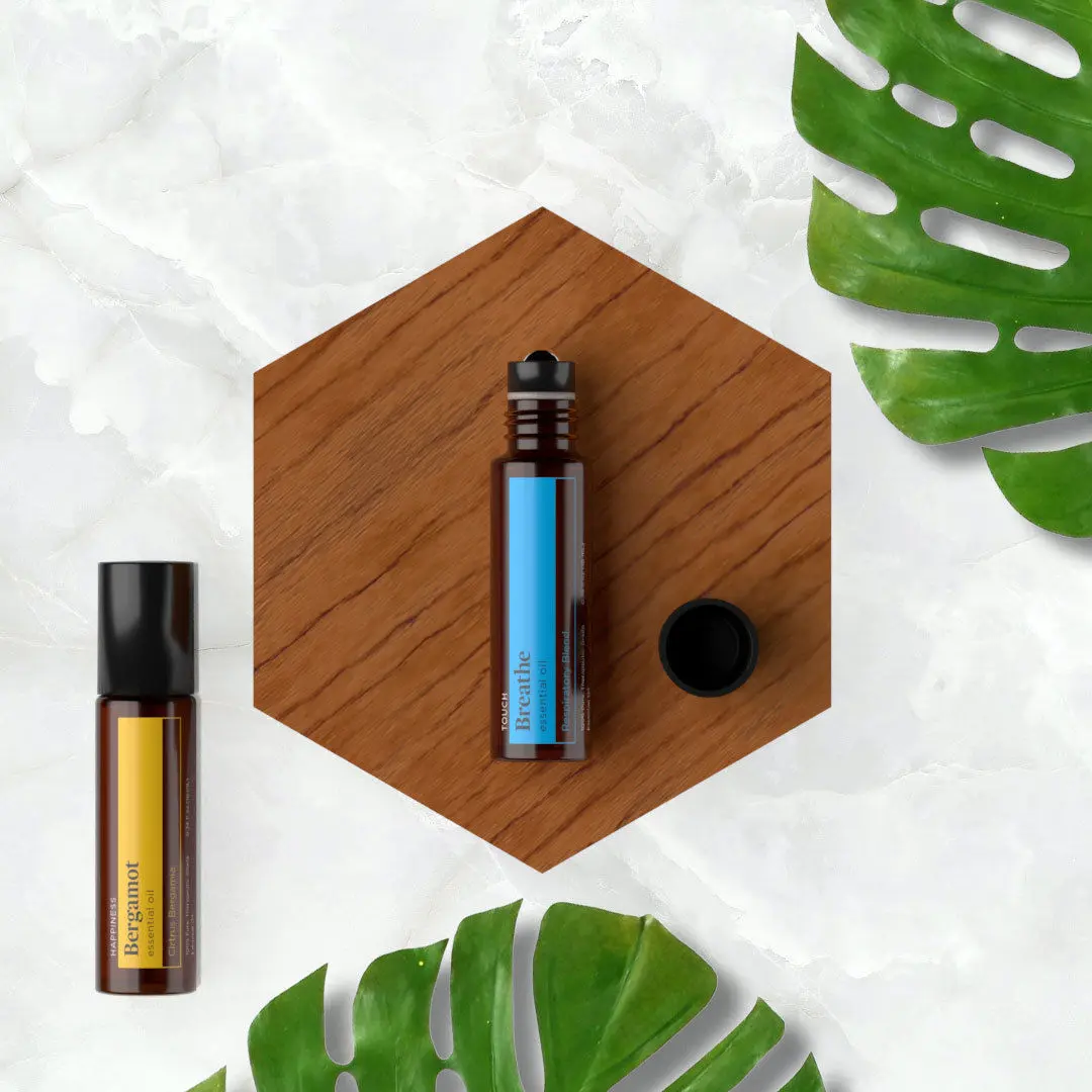 Comes with styled Amber and Clear Glass Roller Bottles, Liquid Fill, Lid, & Hexagon Platform.