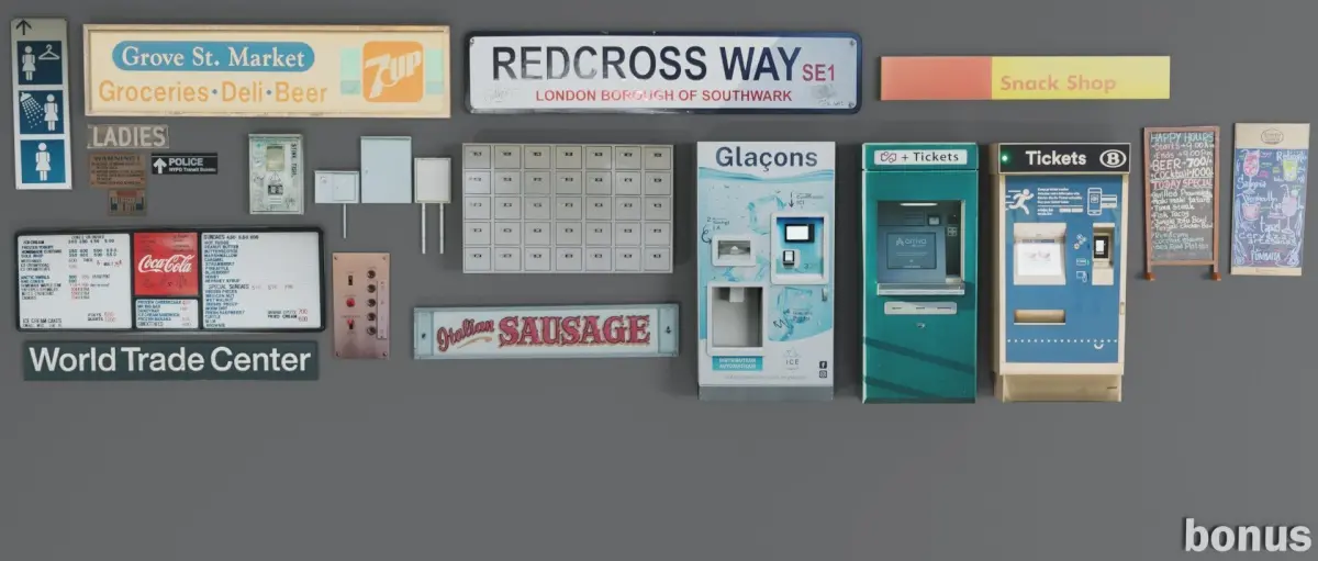 This kit was made in Blender and rendered in Cycles as shown in the preview image. This random collection combines many assets I thought were cool, and I hope you find them cool. It contains 65 different objects and is perfect for adding details to your outdoor scenes.