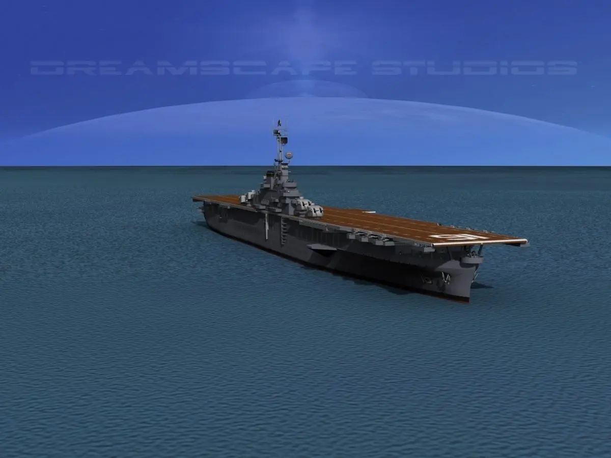 This model is built generally in approximate dimension and includes a lot of detail. It comes fully textured with all materials and textures and is available in many formats. It is built in the WWII configuration with very detailed and animateable 40MM anti- aircraft guns, 20 mm anti-aircraft guns, and four twin mounted 5” 38 caliber guns in turrets. It has radar and radio antenna built and the radar antenna are animated. The screws and rudder are also animatable. Elevators can be raised and lowered. These models render very well and look very realistic using good animation and rendering technique. Designed to carry a larger air group Essex was over sixty feet longer amd ten feet wider in beam, and more than a third heavier than the previous Class Carriers. Machinery arrangement and armor protection was greatly improved from previous designs. In fact, during the WWII, none of the Essex-class carriers were lost and two, USS Franklin (CV-13) and USS Bunker Hill (CV-17), came home under their own power even after receiving extremely heavy damage and were successfully repaired.