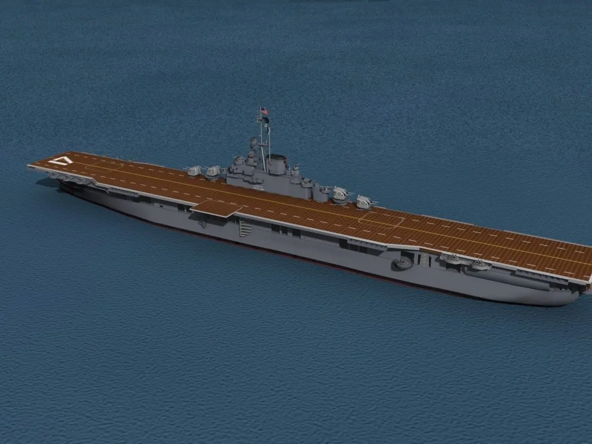 This model is built generally in approximate dimension and includes a lot of detail. It comes fully textured with all materials and textures and is available in many formats. It is built in the WWII configuration with very detailed and animateable 40MM anti- aircraft guns, 20 mm anti-aircraft guns, and four twin mounted 5” 38 caliber guns in turrets. It has radar and radio antenna built and the radar antenna are animated. The screws and rudder are also animatable. Elevators can be raised and lowered. These models render very well and look very realistic using good animation and rendering technique. Designed to carry a larger air group Essex was over sixty feet longer amd ten feet wider in beam, and more than a third heavier than the previous Class Carriers. Machinery arrangement and armor protection was greatly improved from previous designs. In fact, during the WWII, none of the Essex-class carriers were lost and two, USS Franklin (CV-13) and USS Bunker Hill (CV-17), came home under their own power even after receiving extremely heavy damage and were successfully repaired.