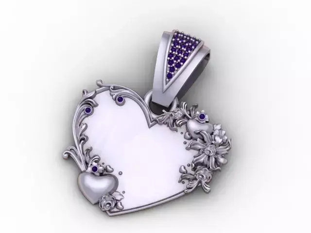 A beautifully sculpted 3D printable heart pendant adorned with ornate floral vines, tiny gemstone accents, and a diamond-paved bail. Perfect for romantic gifts, bridal jewelry, and elegant fine-jewelry collections.