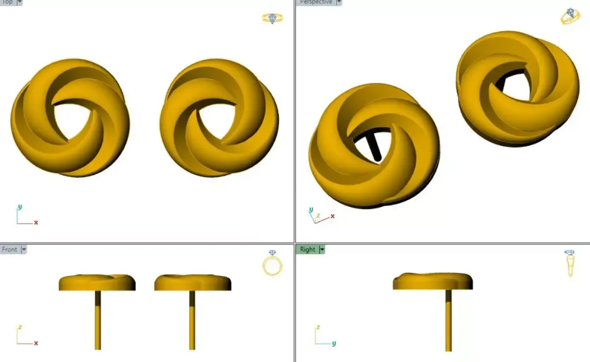 This 3D gold stud earring model features a modern circular swirl design, making it both elegant and versatile for any jewelry collection. The smooth curves and high-polish detailing make it ideal for luxury jewelry visualization, manufacturing prototypes, or 3D printing projects.