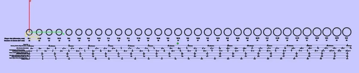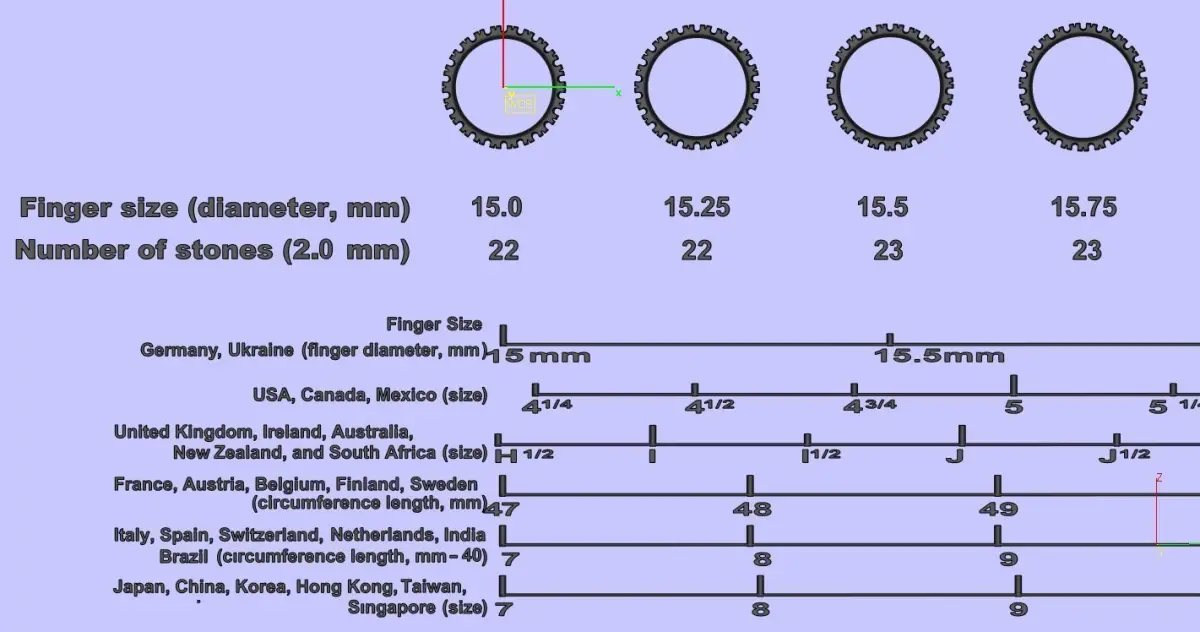 - Asia (Japan, China, Korea), size: 7 - 31Gems, used here are 2.0 mm. Number of stones is from 22 pcs (size 15.0) till 32 pcs (size 23.0)B
