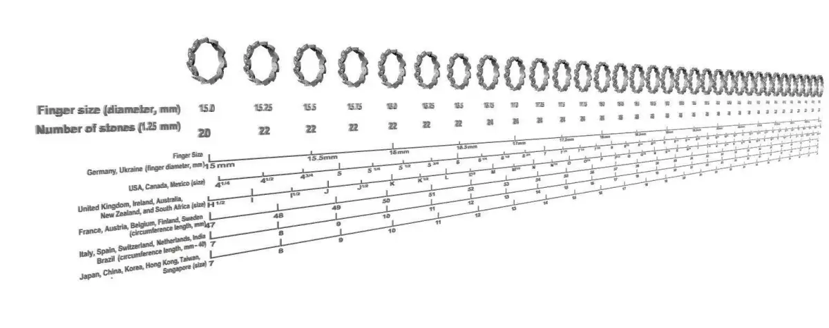 - Germany, Ukraine (finger diameter), mm: 15 - 23 (with increment 0.25 mm)
