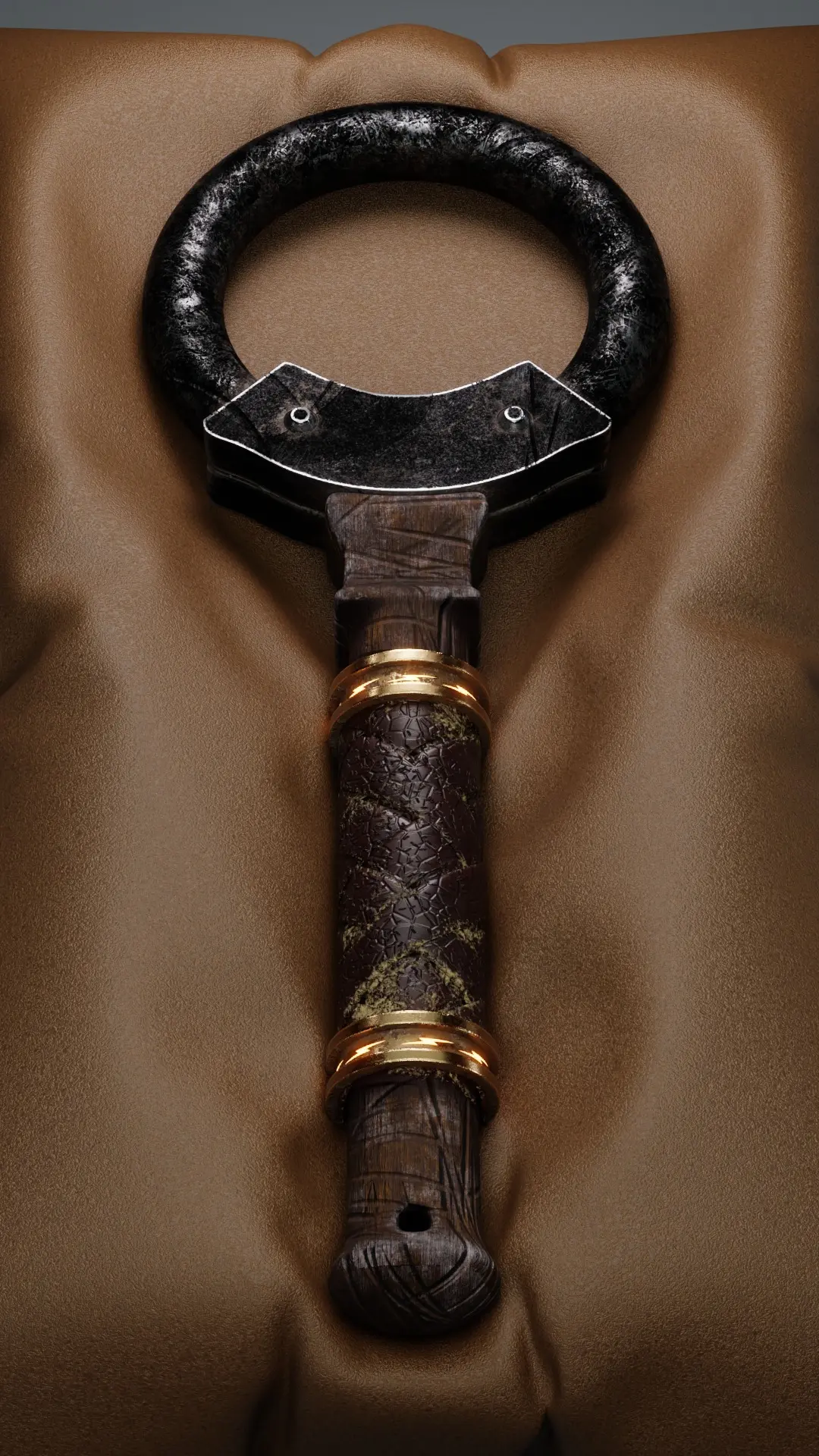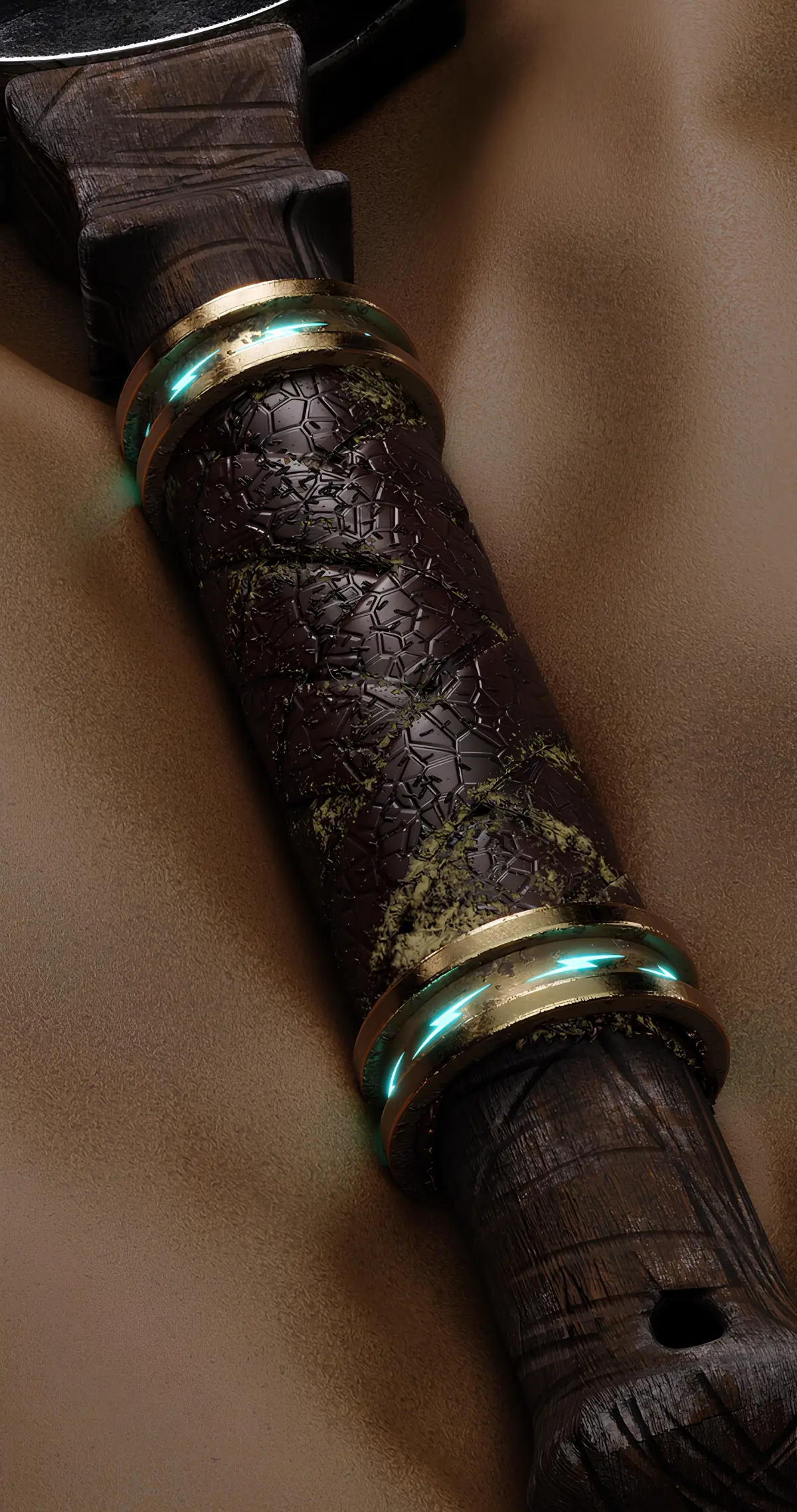 This unique handcrafted weapon combines the elegance of a ringblade with the sturdiness of a battle tool. Featuring a meticulously textured ebony-like circular blade, it is complemented by an intricately carved wooden handle. The handle is wrapped in luxurious embossed leather, adorned with golden accents and glowing turquoise rings, giving it an aura of mysticism and power. Perfect for collectors, cosplayers, or fantasy enthusiasts, the Ethereal Ringblade balances beauty and functionality, making it a standout piece in any collection.