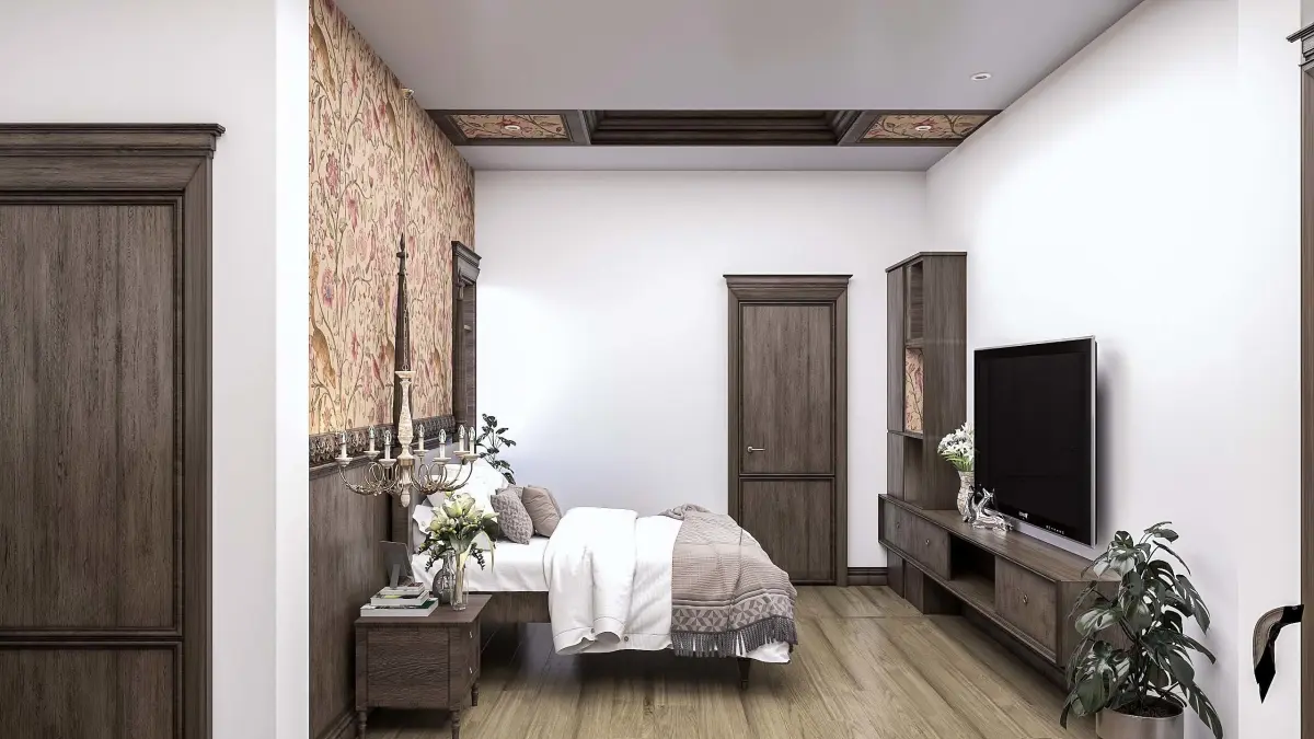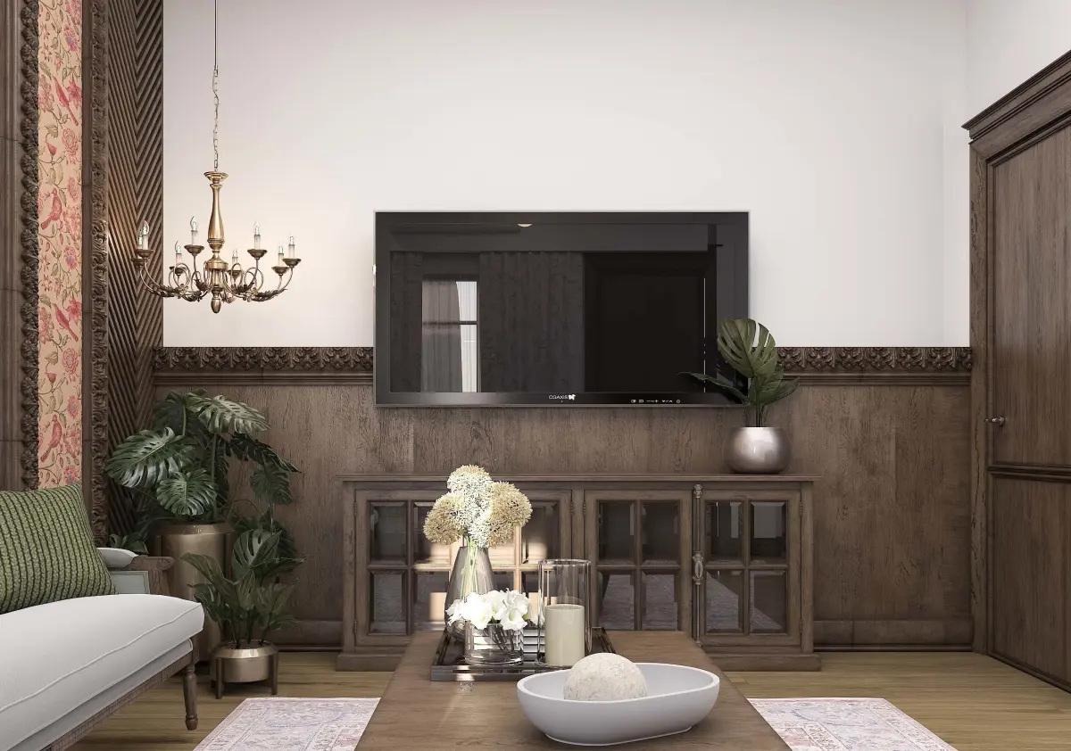 Ethnic bedroom with living room with tv unit and sofa chair sitting Ready to render using V-Ray 5, 3dsmax 2022 scene of a Ethnic Bedroom