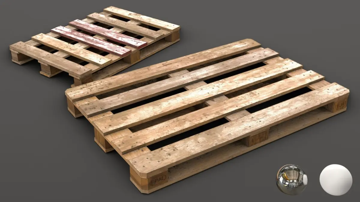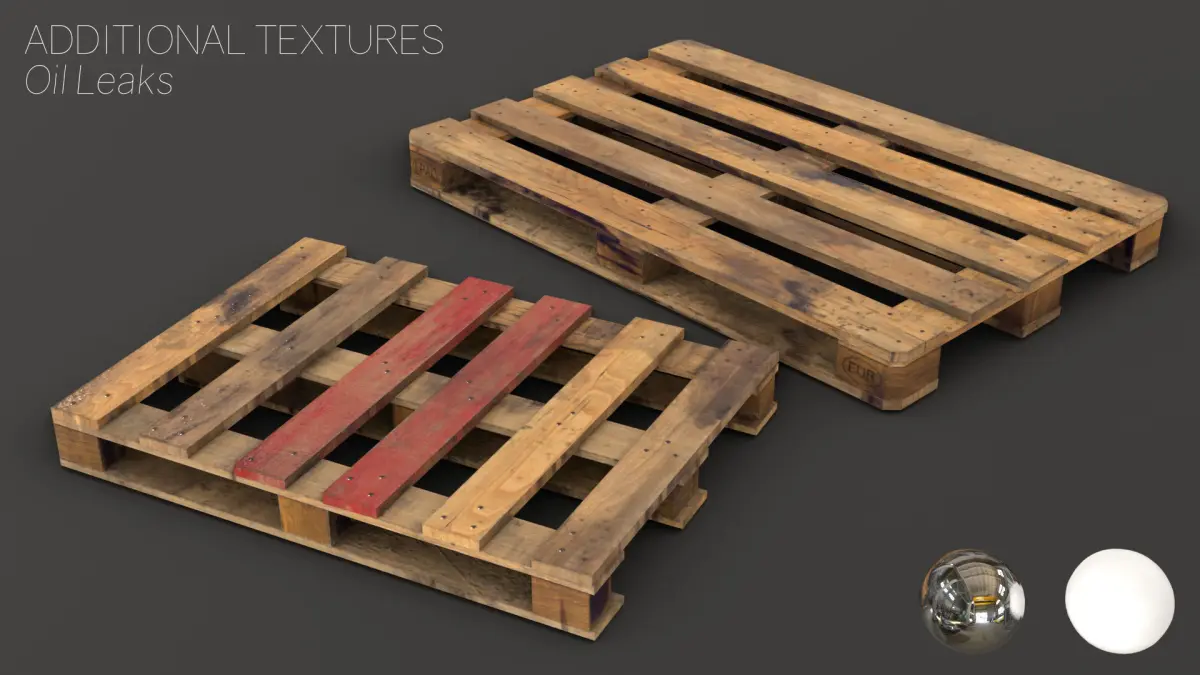 This asset includes 2 sizes of wooden pallets. A 1200 x 800 mm pallet (Eur-Epal) and an other to 880 x 620 mm (Dussledorf). This 2 objects are available individually or in 4 pre-assembled assets to be directly add into your own 3D scenes. Also, the model includes 2 variants of the textures with an additional oil leaks textures set more.