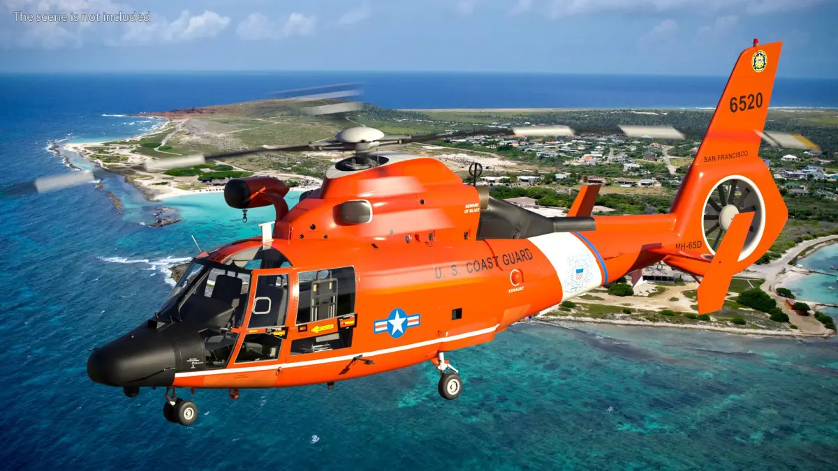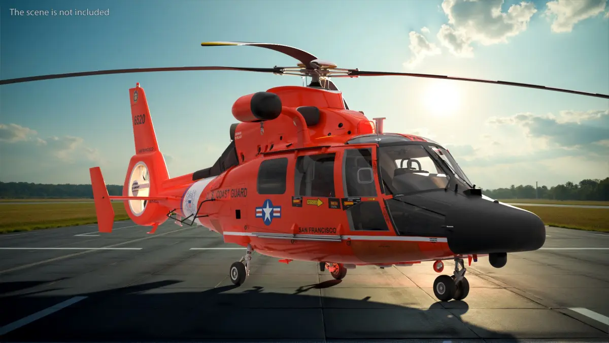 Eurocopter MH 65 Dolphin Coast Guard Rigged is a 3d model of twin-engine helicopter used primarily by the United States Coast Guard (USCG) for various missions, including search and rescue (SAR), law enforcement, and maritime patrol.