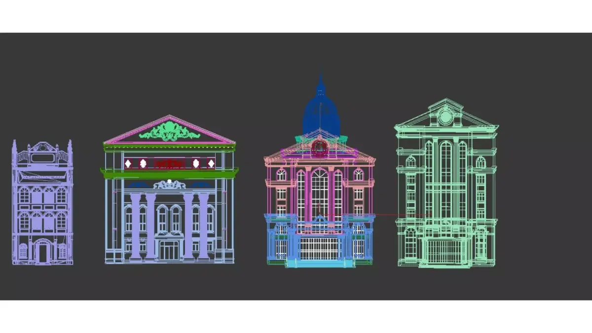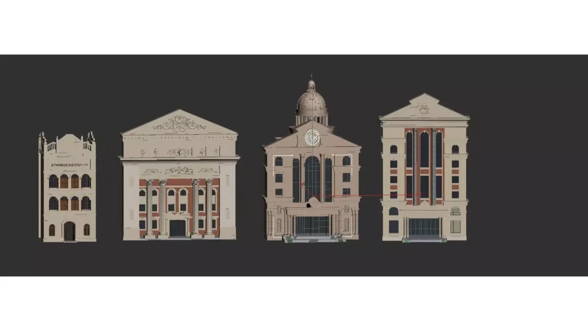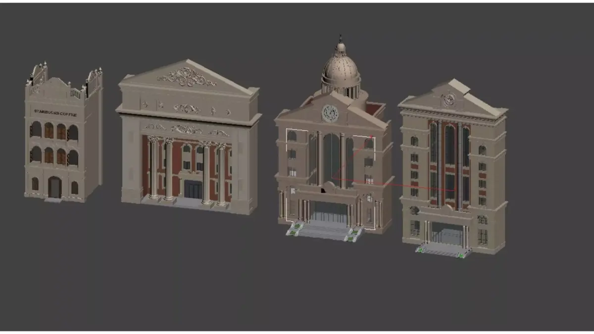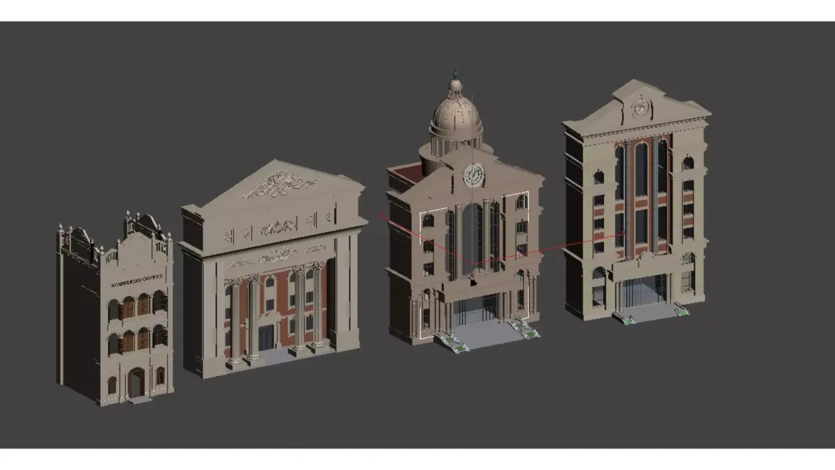 This is a set of European classical and neoclassical style buildings, featuring soft tones such as light beige and warm brown, showcasing different classic architectural vocabulary:Left side buildingThis is a three story small commercial building with exquisite pointed decorations on the top, a beige stone facade, and brown wooden blinds. The first floor has an arched main entrance, while the second and third floors have continuous arched windows with the words STARBUCKS COFFEE on the top. The overall style is a neoclassical commercial renovation.Left second buildingThis is a solemn neoclassical building with a symmetrical layout. There are four tall Ionic columns supporting the triangular gable on the front, and exquisite relief patterns on the gable and eaves. The wall is mainly made of beige stone, with some red bricks embellished. The entrance is a double door, with a grand overall atmosphere, similar to a bank, theater, or city hall.Right second buildingThis is a Baroque style building with four tall Corinthian columns on the front, a large glass curtain wall in the center, and a prominent dome and clock at the top. There are wide steps at the entrance, which are overall magnificent and solemn, commonly found in courts, museums, or landmark buildings.Right side buildingThis is a neoclassical high-rise building with a fa ç ade designed with alternating white stone and red brick. The center features a large vertical glass window, and the top is adorned with triangular gable walls and circular decorations. The entrance has glass doors and steps, with a simple yet elegant overall line, suitable for use as an office building or high-end commercial complex.These models collectively showcase the symmetrical aesthetics, columnar structure, and ornate decoration of European classical architecture, while incorporating modern materials and functionality, making them a design paradigm that blends history and modernity.