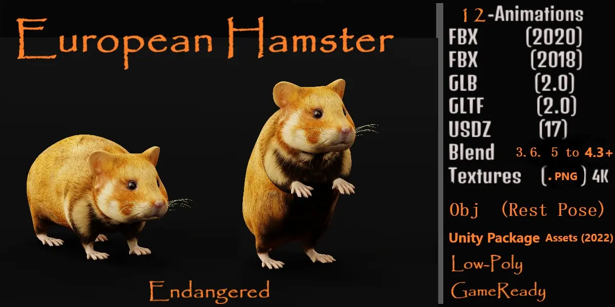 The European hamster, also known as the Eurasian hamster, black-bellied hamster or common hamster, is the only species of hamster in the genus Cricetus. It is native to grassland and similar habitats in a large part of Eurasia, extending from Belgium to the Altai Mountains and Yenisey River in Russia..3D European Hamster Rodent Animal Model By Nyilonelycompany.