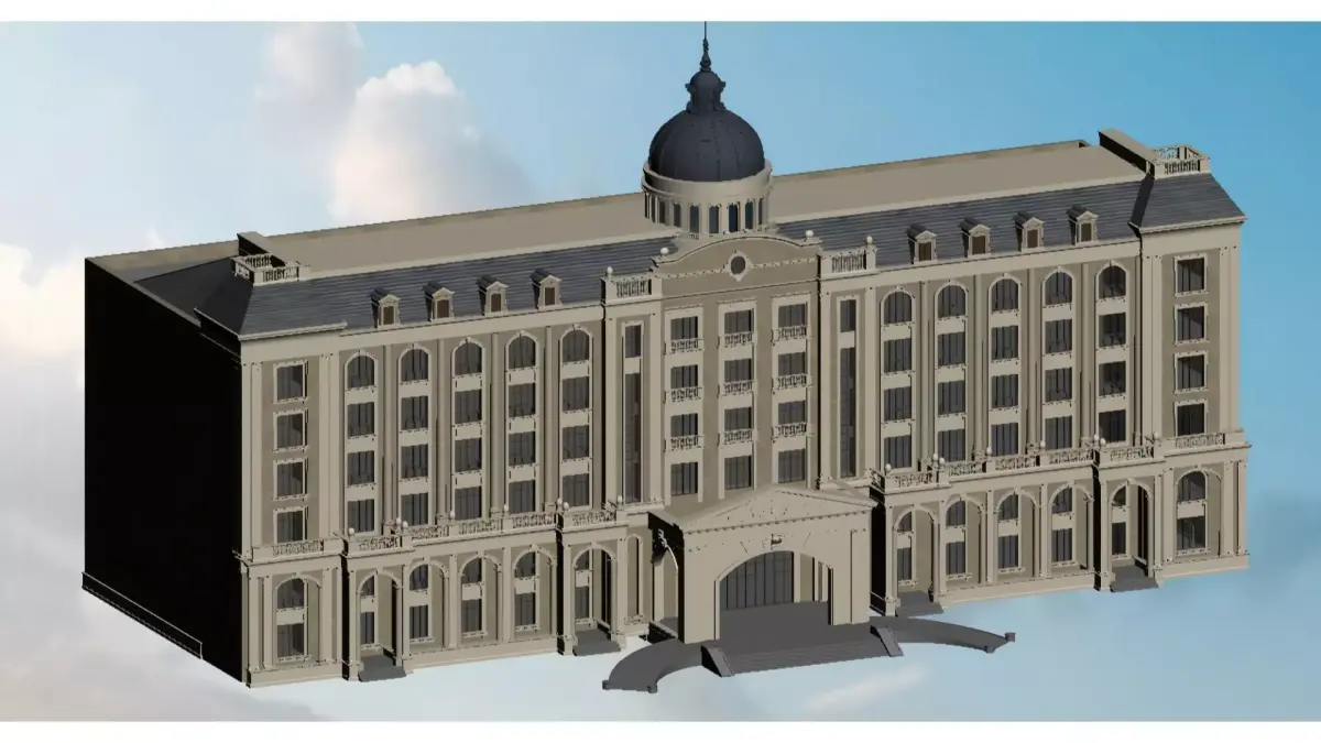 This is a large-scale building designed in the European Neoclassical style. Built on the basis of a symmetrical layout and beige facades, it is adorned with iconic domes and arch elements. Its wide, imposing entrance, coupled with the overall design, exudes a palace-like elegance and luxury. As a public building that combines visual distinctiveness with functionality (it is often used as a venue for high-end catering and banquets), it boasts exquisite design details and a spacious, grand ambiance.