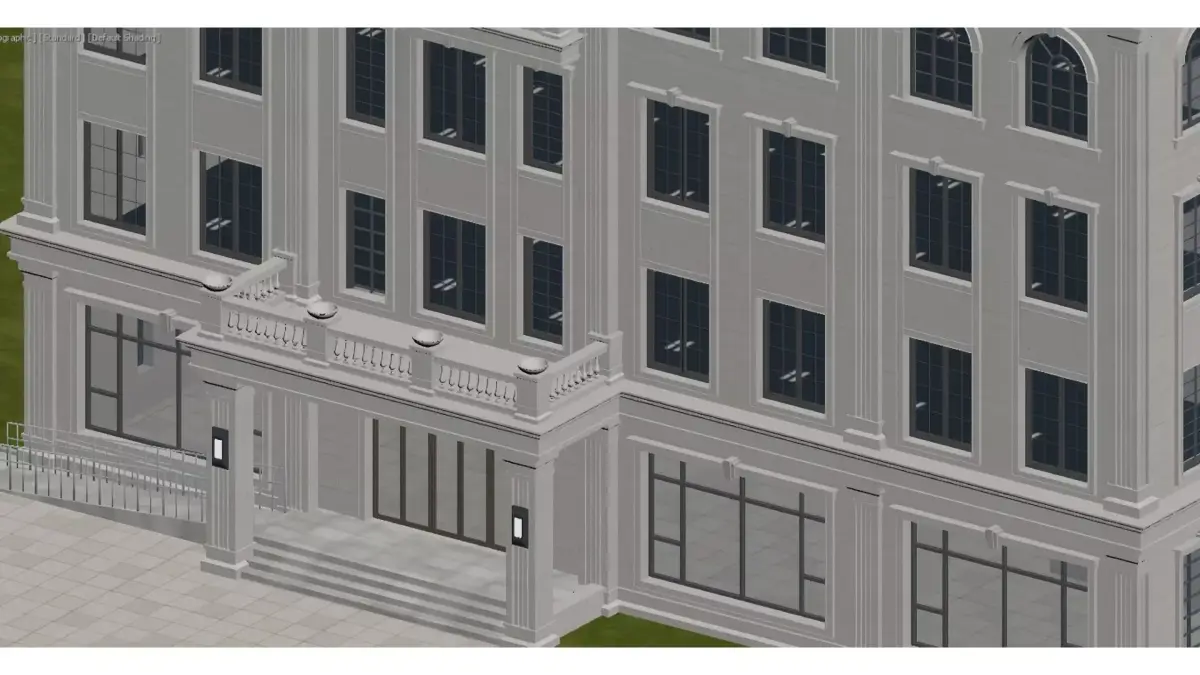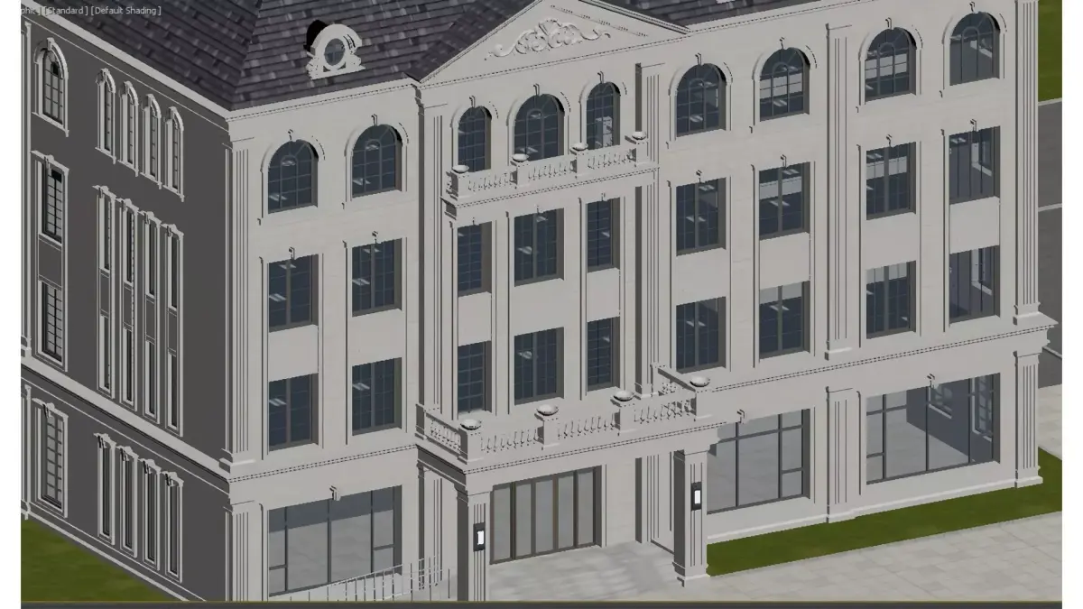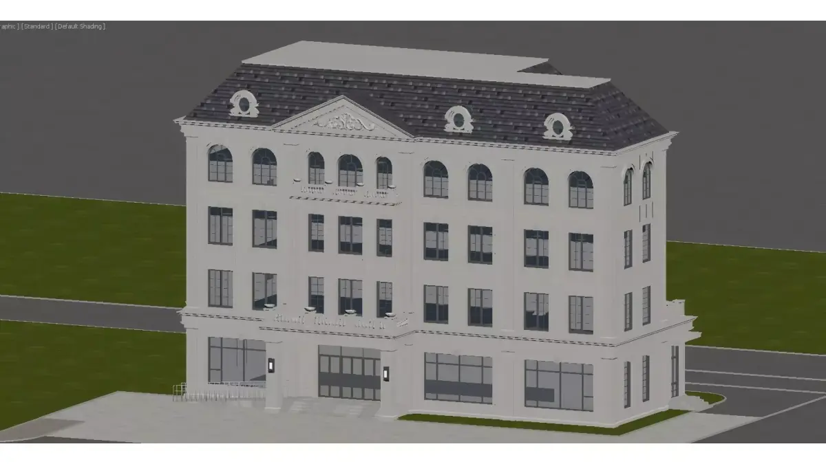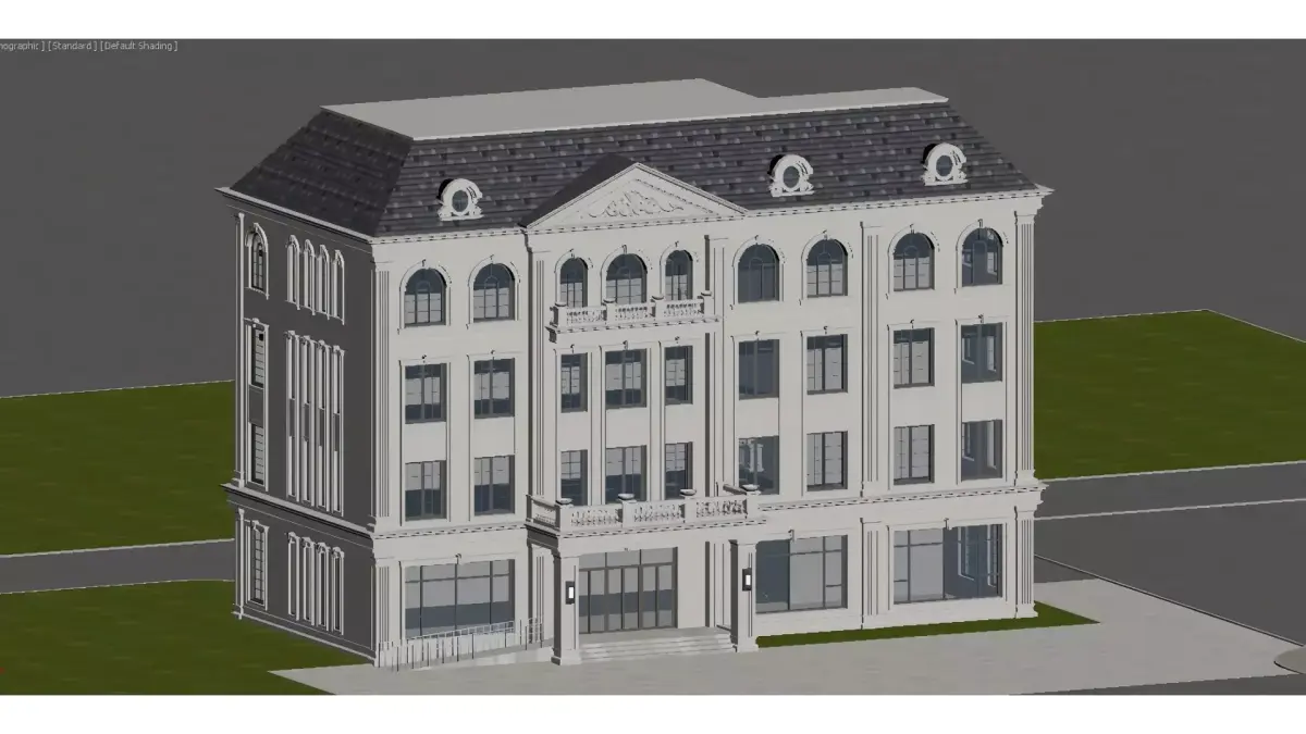 This is a multi-storey detached building in a European (predominantly French) architectural style. Its facade is made of white stone, paired with a dark sloped roof and arched windows. The exterior is adorned with columns, carvings and balcony railings. The overall design is exquisite and elegant, embodying both the luxury of a high-end residence and the refined details of architectural aesthetics.