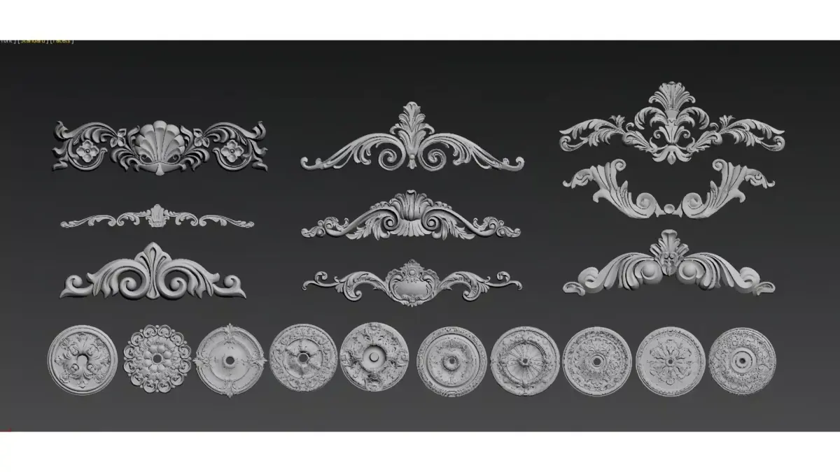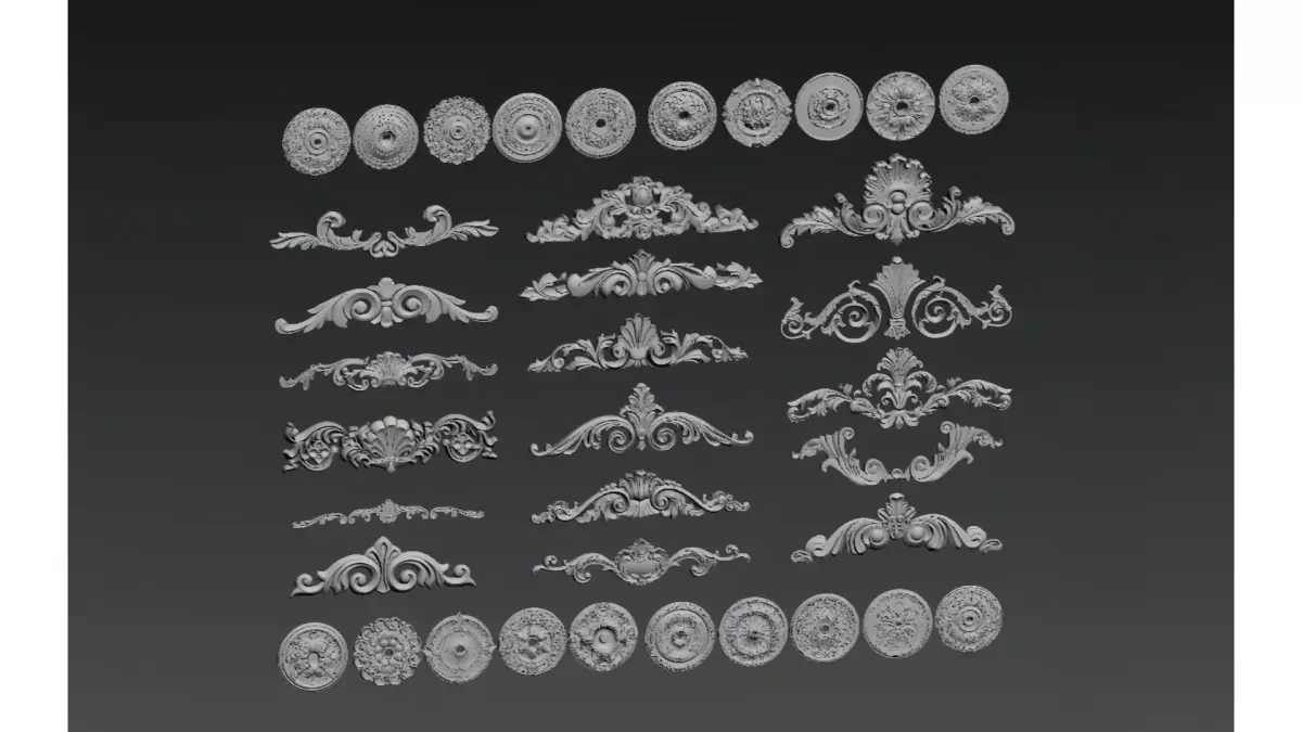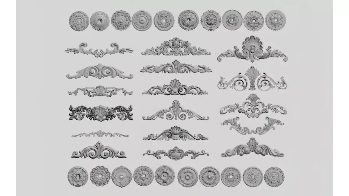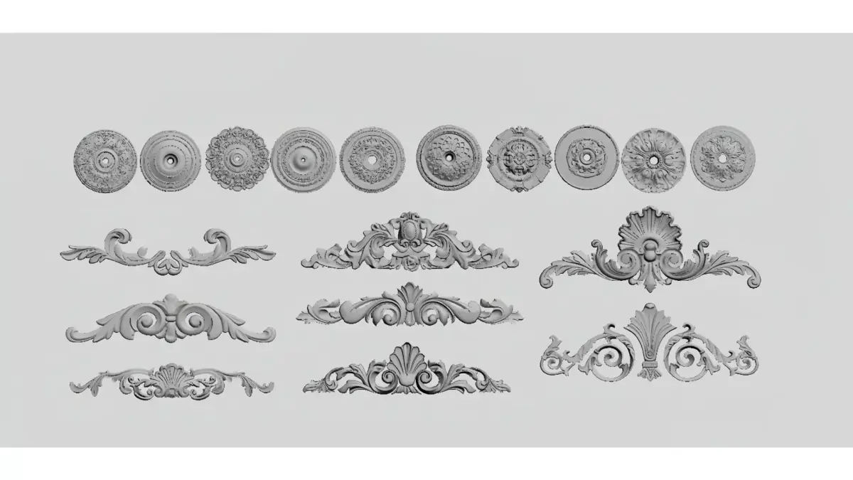 This is a set of white gypsum carved decorative elements in European retro style, including various shapes such as circular plaques, corner carvings, and long reliefs.The design integrates the intricate aesthetics of Baroque and Rococo styles, with curled floral leaves, symmetrical patterns and three-dimensional relief textures as the core. It can be applied to decorative scenarios like walls, ceilings and furniture, adding an elegant and luxurious retro atmosphere to the space.The materials are suitable for soft decoration design, 3D modeling and reference for European-style decoration, and have both decorative and practical value.