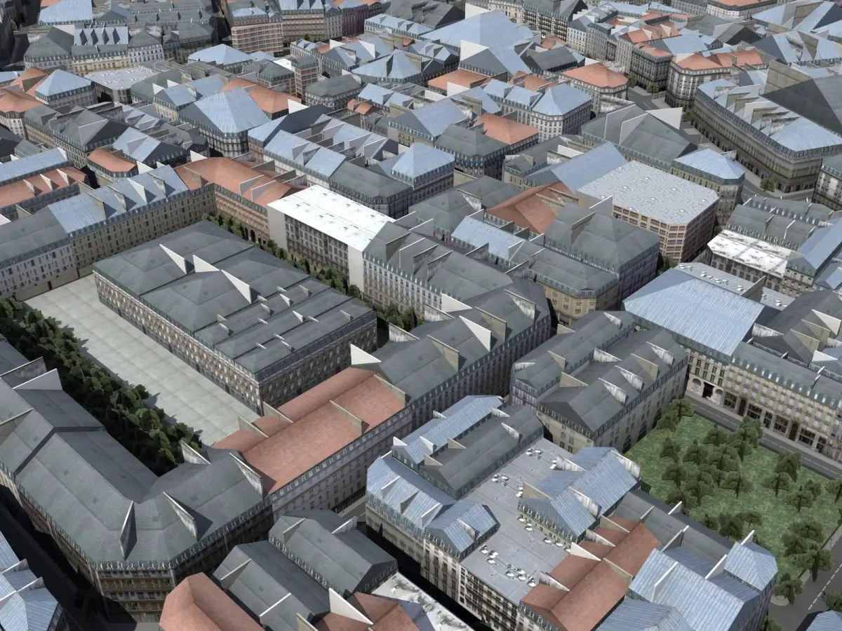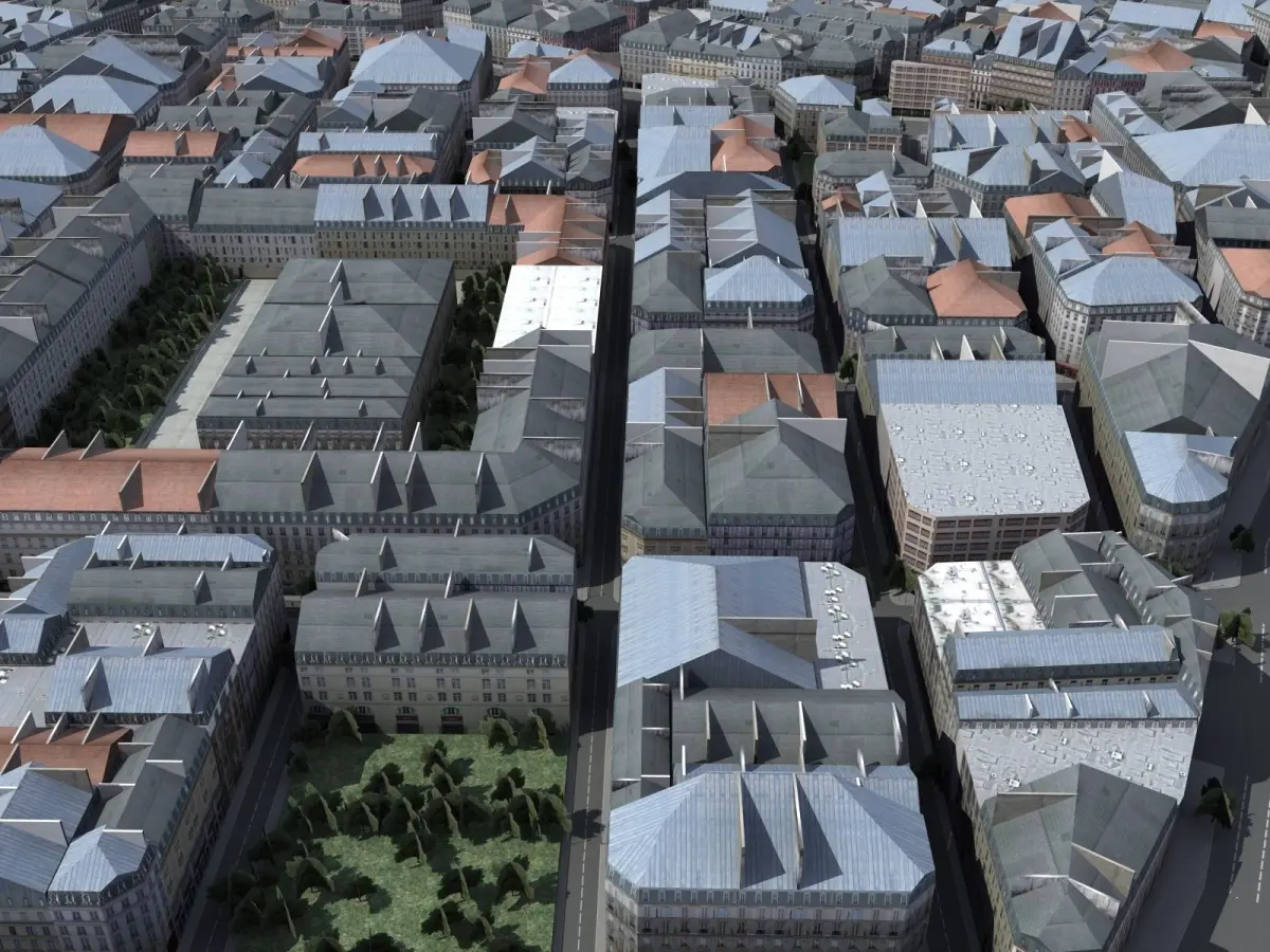 European style organic city core model. Includes apartments, offices, houses, shops, parks, roads and street furniture. Covers a large area(1.6km x 1.6km) with irregular 'organic' streets of varying width. Each building is unique. Max version includes lighting and cameras, ready to render (but not sky image).
