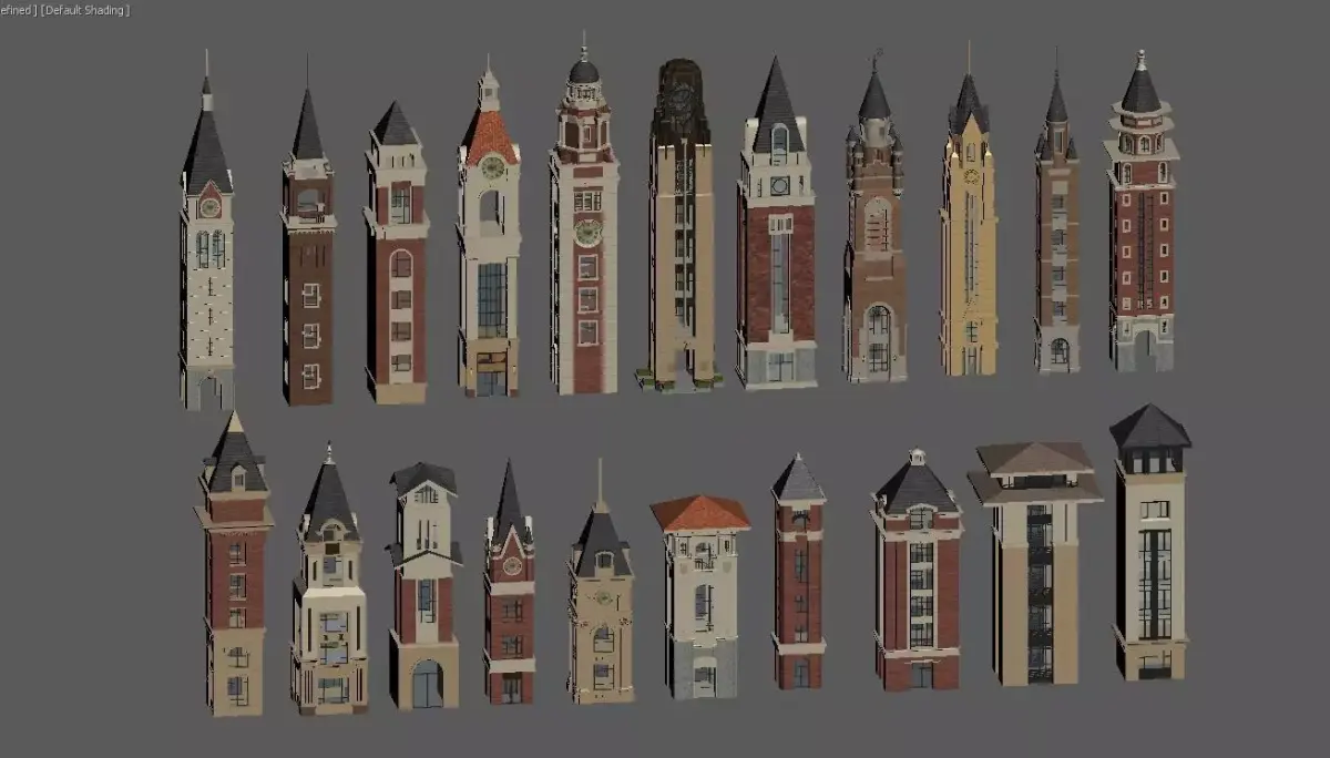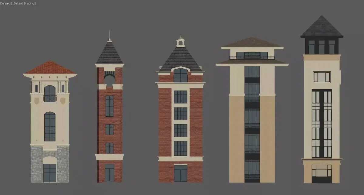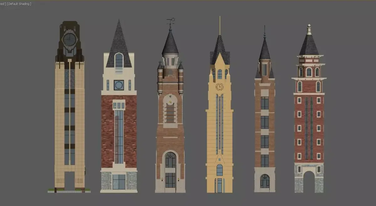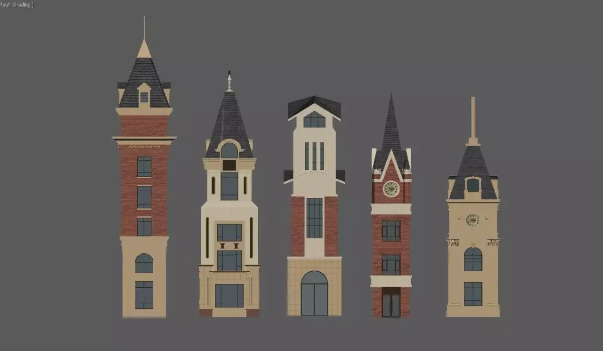 This is a collection of 3D renderings of European-style clock tower and turret building models, which exude a strong retro collegiate style.Diverse styles: They incorporate classic elements such as Gothic spires, red-brick facades, and stone bases, with some towers also featuring exquisite clock decorations.Rich colors: Dominated by reddish-brown, off-white, and dark gray, with accents of gold, black, and other details, creating distinct visual layers.Exquisite structures: From the towering spired clock towers to the square turrets, each building showcases a unique facade design and aesthetic proportion, making them suitable for use as architectural design references, game scene assets, or decorative illustrations.