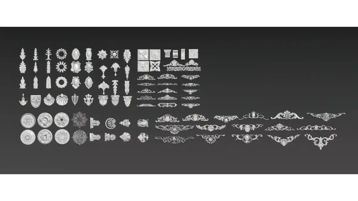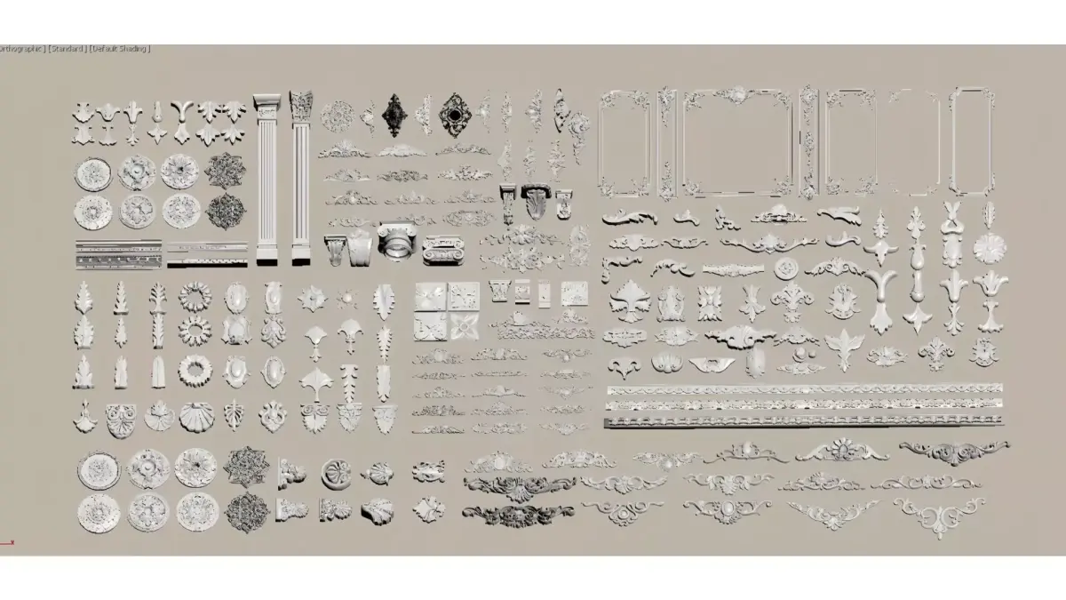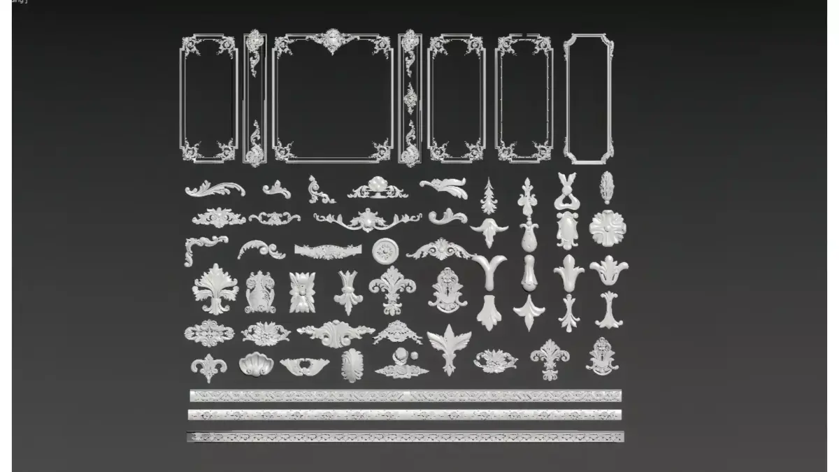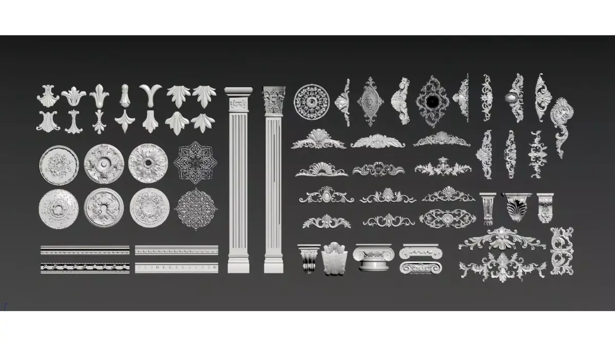 This is a collection of European classical-style decorative components, including pillars, carved lines, relief plaques, decorative borders, patterned corner ornaments and other elements. It combines the soft curves of Rococo with the intricate details of Baroque. Mostly featuring a white gypsum texture (or 3D model materials), it is suitable for the decorative design of walls, ceilings and furniture, and serves as a material pack of decorative accessories for retro-style space/model creation.